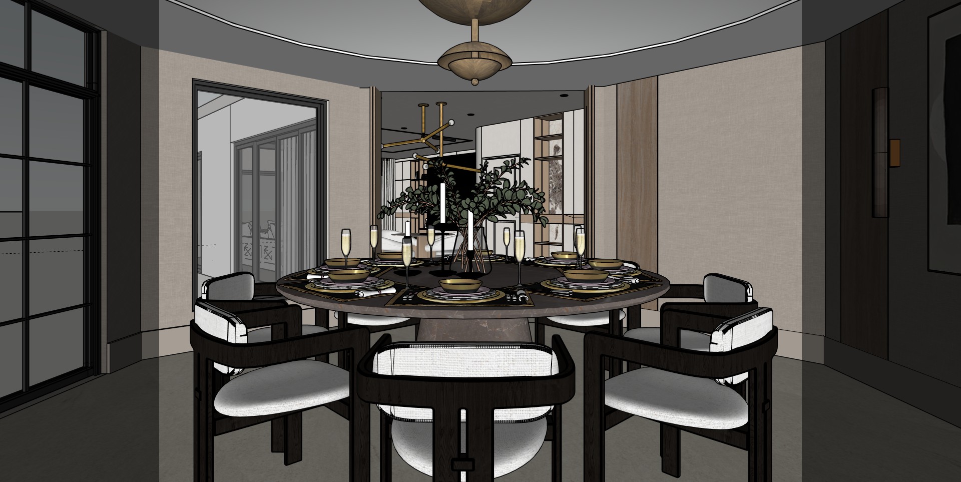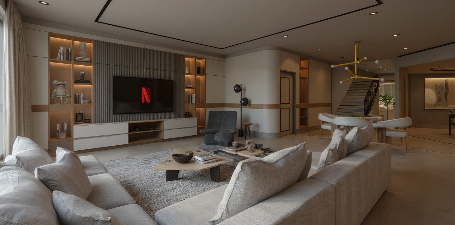 create a beautifully rendered modern living area use a soft warm color palette with ecru matte flooring the walls should be a sophisticated light grey and the cabinetry in ecru with wood accents keep concave panels on tv back wall incorporate black metal accents in the furniture and fixtures for a chic contrast ensure the atmosphere feels inviting and cozy with soft lighting to enhance the warm homely ambiance keep all original color of materials add subtle sunlight add background of garden with swimming pool outside windows turn on lights 3 panels at the back make it mirrors dome ceiling with cove lighting