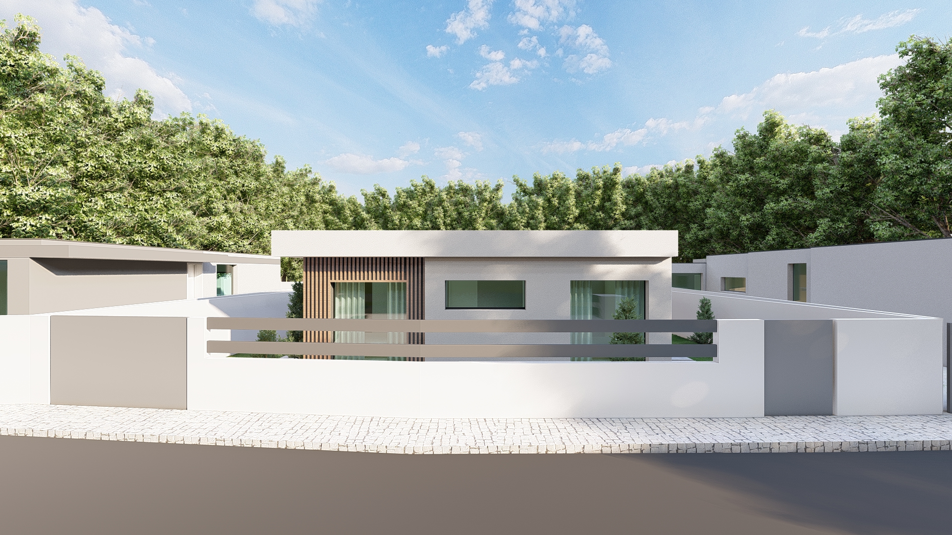 ilumin o natural do sol com sombras das arvores refletido na fachada da casa relva verde no chao com lajetas de passadeira fachada com dois materiais madeira ripada e partes branca com grandes v os de janela casa inserida no meio urbano com background com casa com estilo mediterraneo lado a lado com os muros da casa muro com com portao solido de acesso a carros e portao solido para pessoas