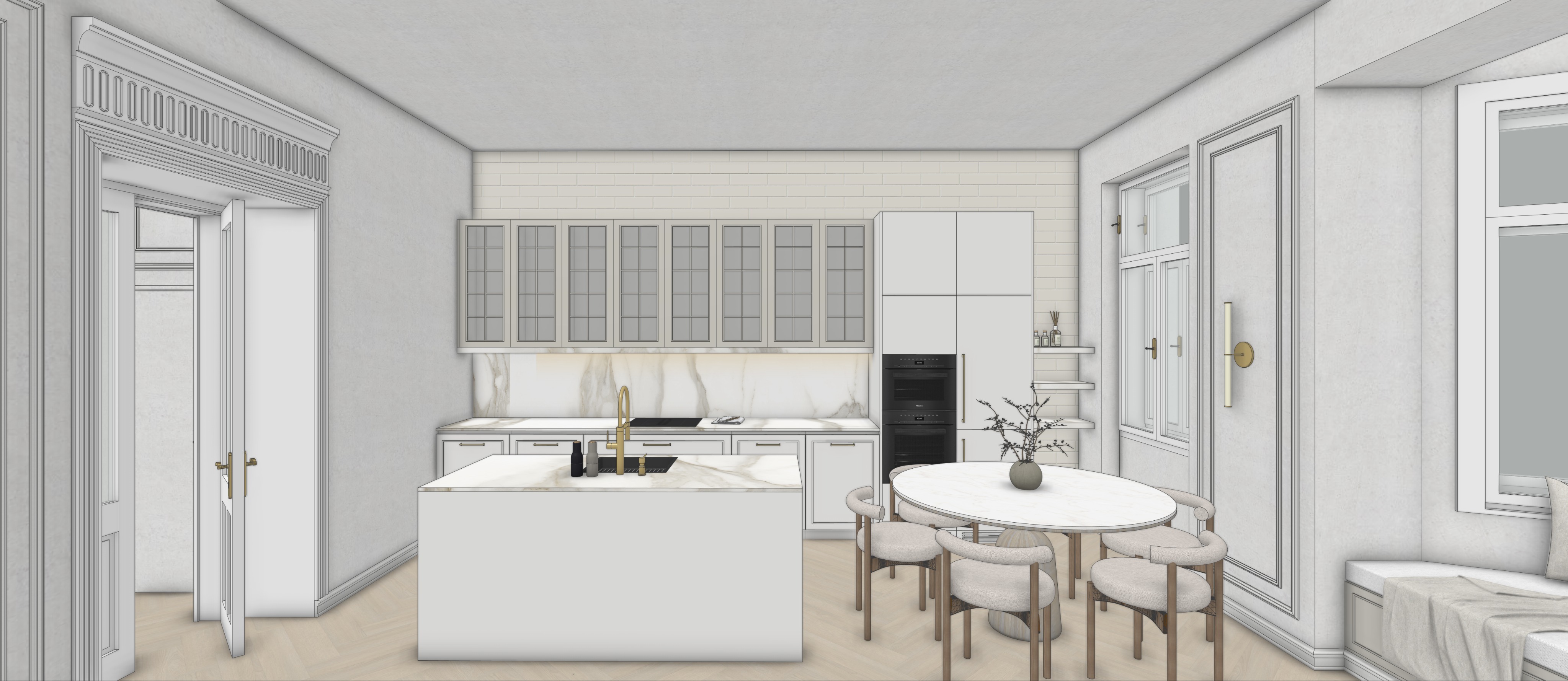 a modern minimalist kitchen interior with an elegant and inviting atmosphere the walls are a white plaster complemented by sleek white off white cabinetry the cabinets have transparent glass doors with a subtle reflective sheen and taupe color the central island features a polished white marble countertop with subtle gray veins the backsplash matches the marble countertop for a cohesive look the flooring is light oak wood adding warmth to the space the oval dining table is white marble paired with light beige upholstered chairs the window frames are crisp white letting in natural light accents include matte black and brass hardware for a touch of luxury the overall atmosphere is bright airy and sophisticated ideal for both cooking and entertaining