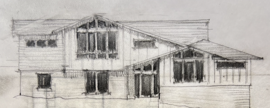 i want this sketch cleaned up and colorized we want a moodier color palette inspiration is a cabin in the woods architecture