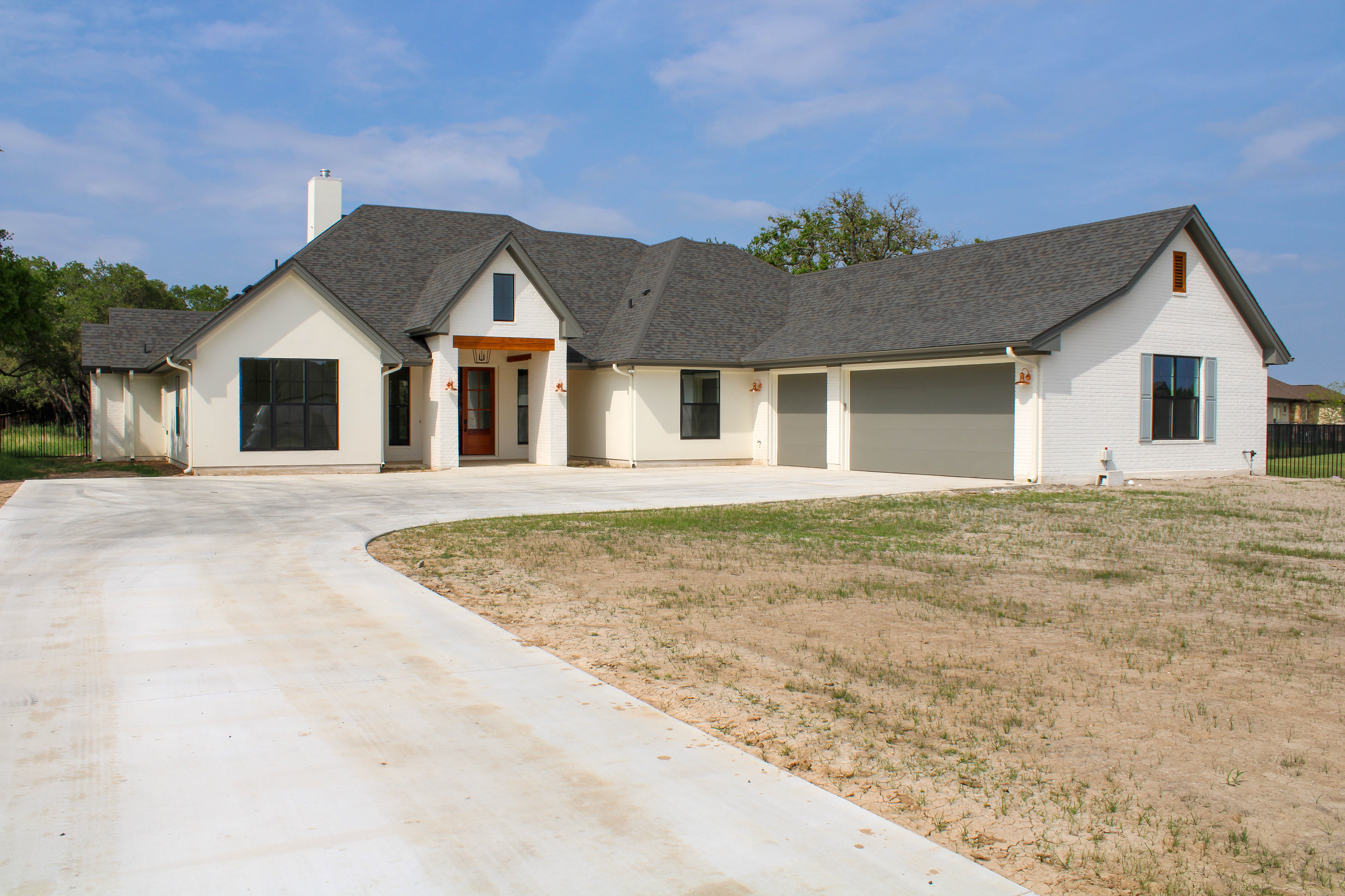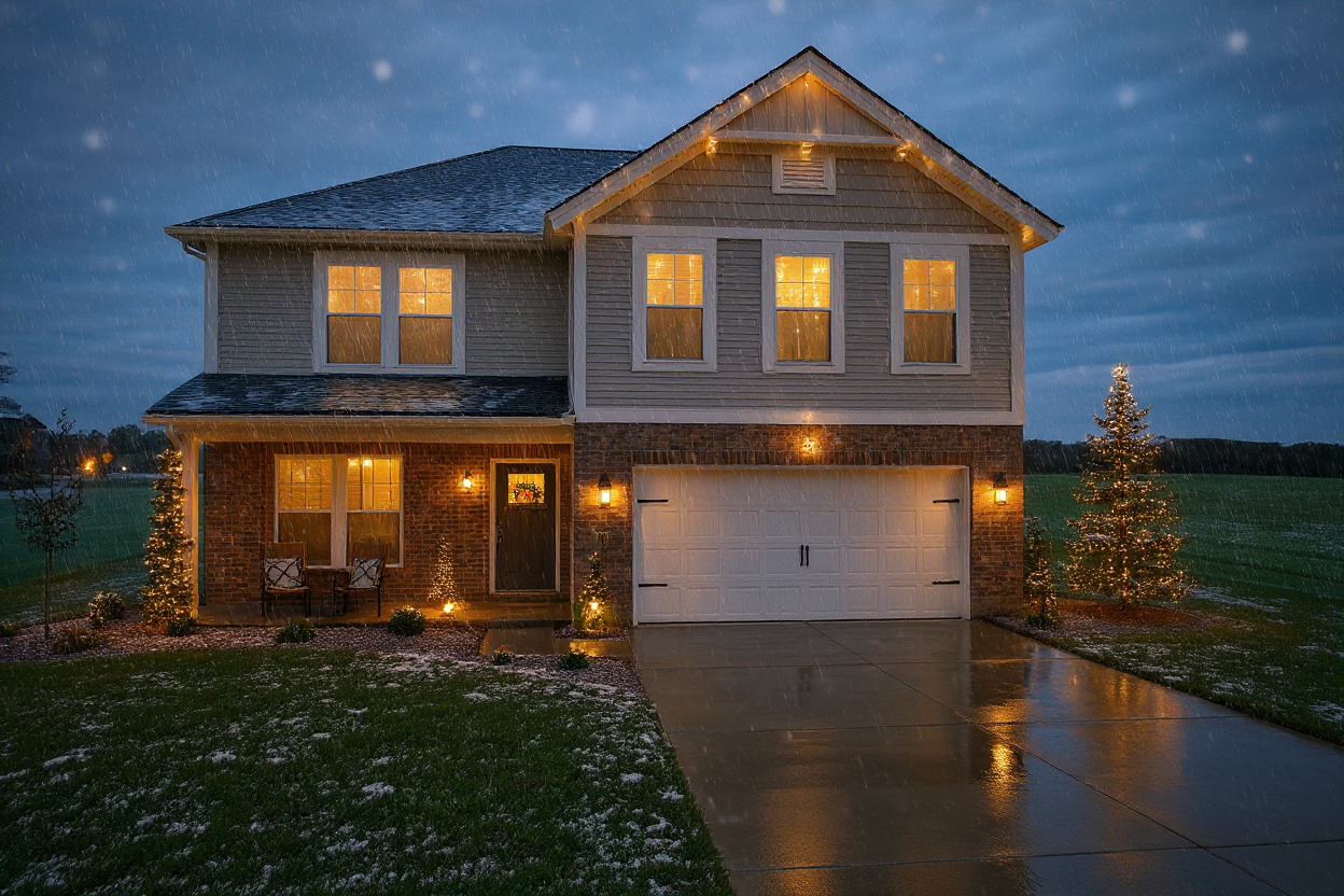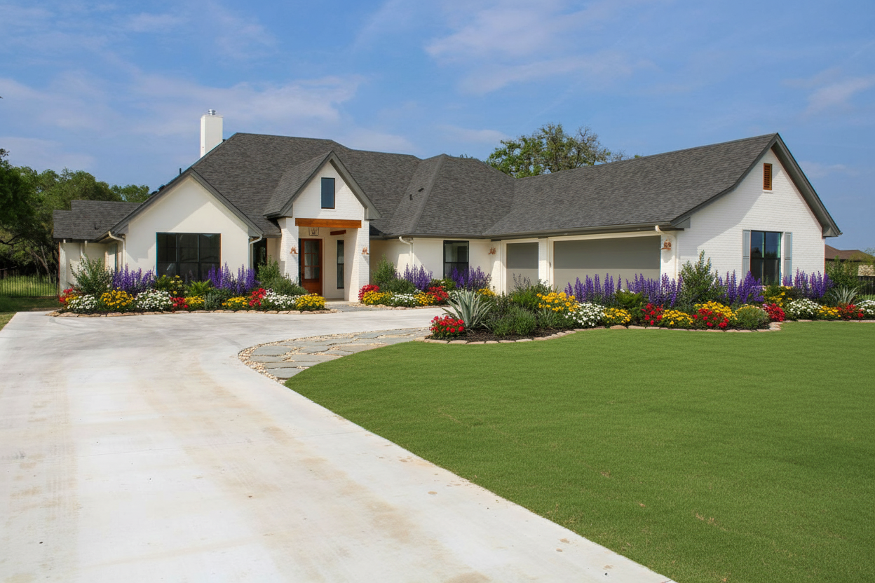 modern suburban house with a charming inviting atmosphere the house features a soft cream exterior with contrasting dark gray shingle roofing large elegant windows reflect the sky adding to the openness and light a wide smooth concrete driveway leads to the two car garage painted in a subtle taupe surrounding the house is a simple rustic landscape with a patchy green lawn and a hint of natural textures the sky is a brilliant blue with soft white clouds adding a peaceful and serene ambiance to the scene