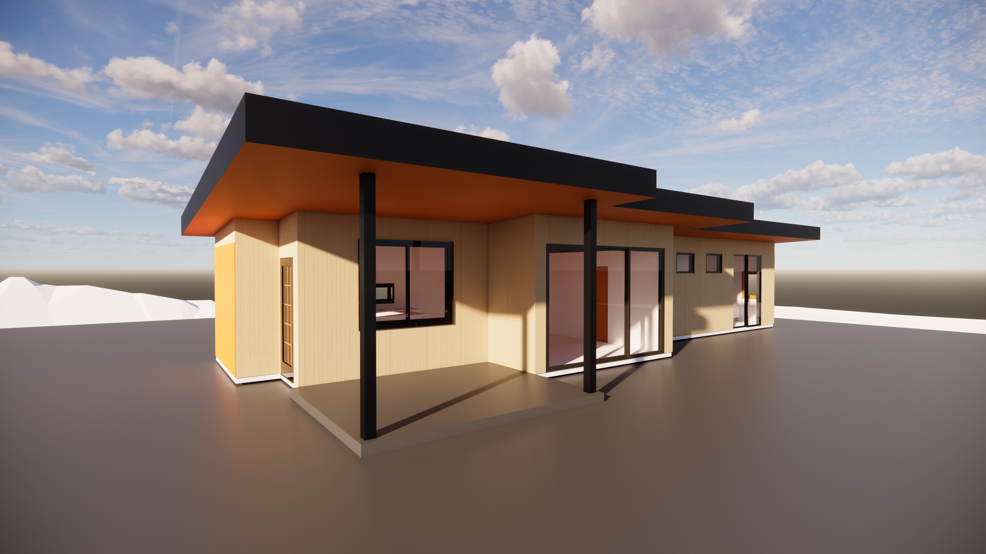 keep the original structure doors and windows add 1tree in the background and a dark wooden fence bright blue sly
