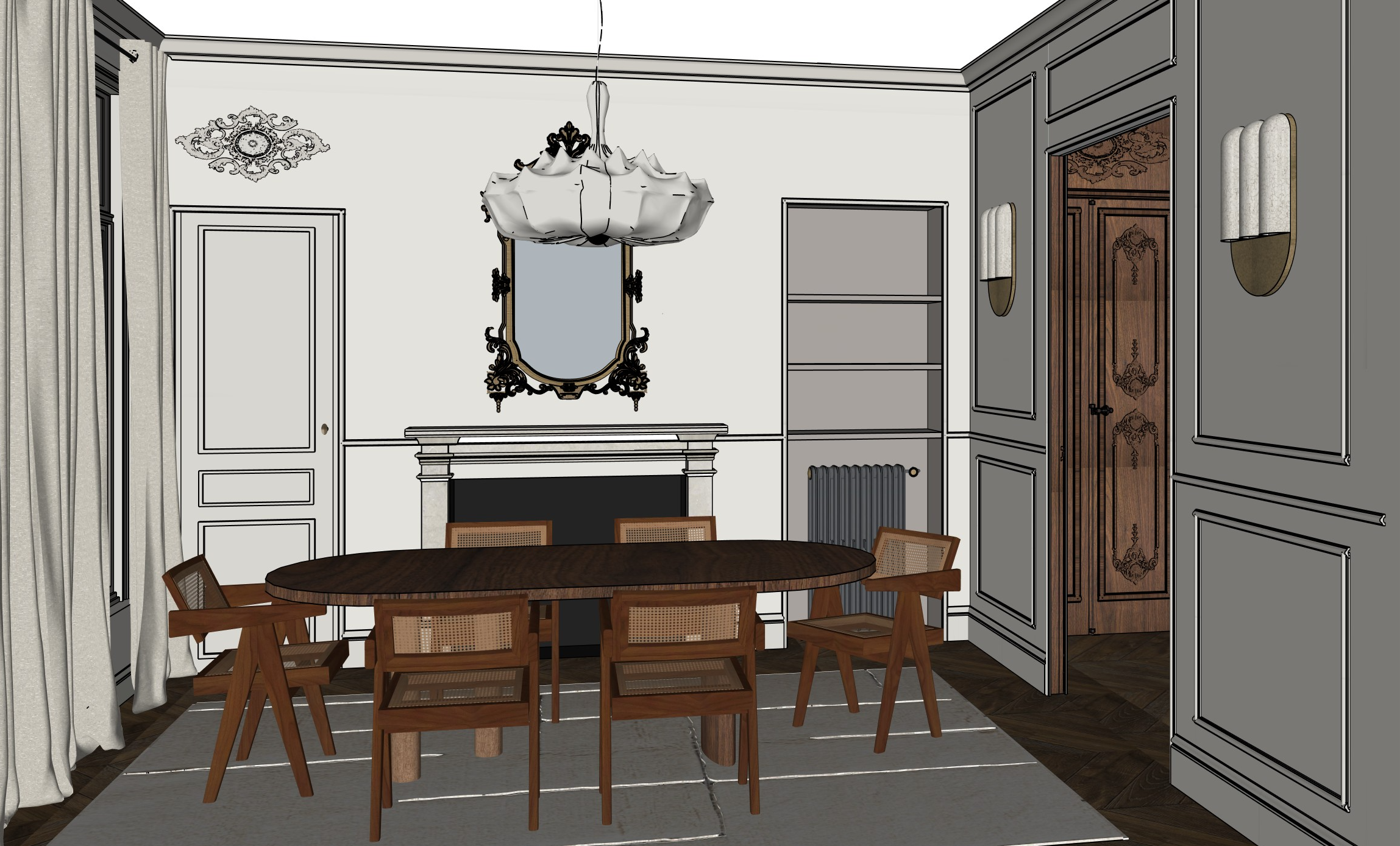 the apartment is on the 3rd floor of a parisian building the walls are in light greige the fireplace is in greige stone the radiator is in dark taupe the chairs are pierre jeanneret chandigarh chairs in walnut like this https www chandigarh design com fr fauteuils le corbusier 10 fauteuil de bureau pierre jeanneret le corbusier html the rug is in light beige the pendant light should be less white and more warm in color the frame of the mirror is in antique brass you can see walnut wood millwork on the wall of the room on the right put some books and deco on the shelves