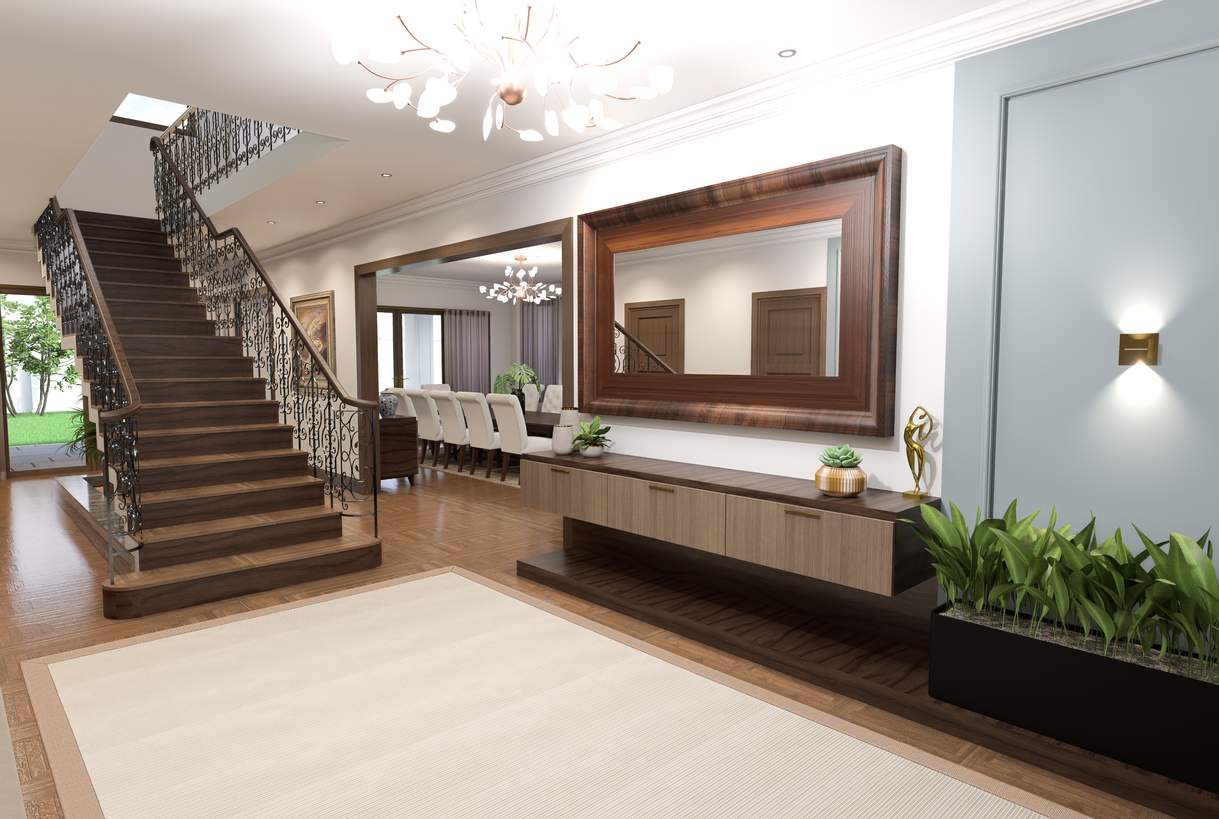 luxury home foyer and entryway focal point illuminated modern white petal branch chandelier on a white ceiling large wooden framed mirror above a contemporary sideboard grand wooden staircase with intricate black iron railings on the left view into a formal dining room with white tufted chairs parquet wood flooring soft cinematic lighting powder blue accent wall high end architectural visualization 8k resolution