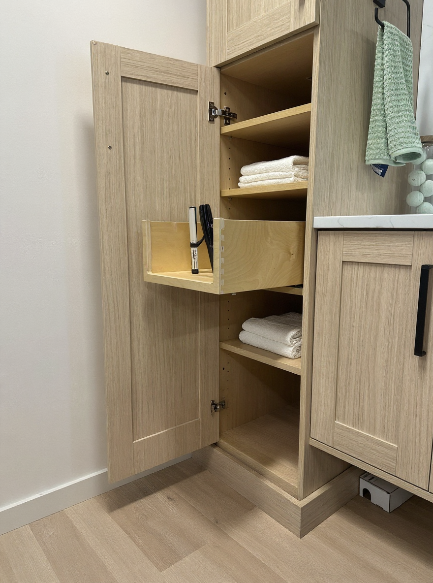 remove the background on the left and change it to drywall remove the white box on the floor add more natural light put folded towels on the two open shelves put curling irons inside the metal rings on the bottom rollout