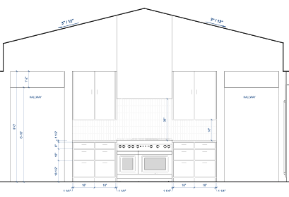 this is the kitchen all cabinets in oak do calacutta quartz counter running up as backsplash left and right side are hallways hood can be a stucco finish