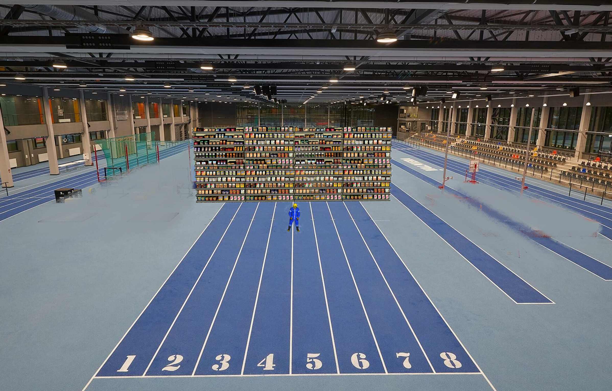 dramatic light on supermarket shelves in the middle of the stadium