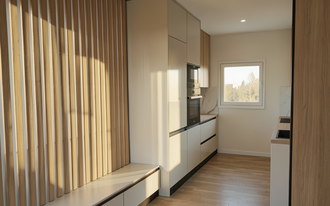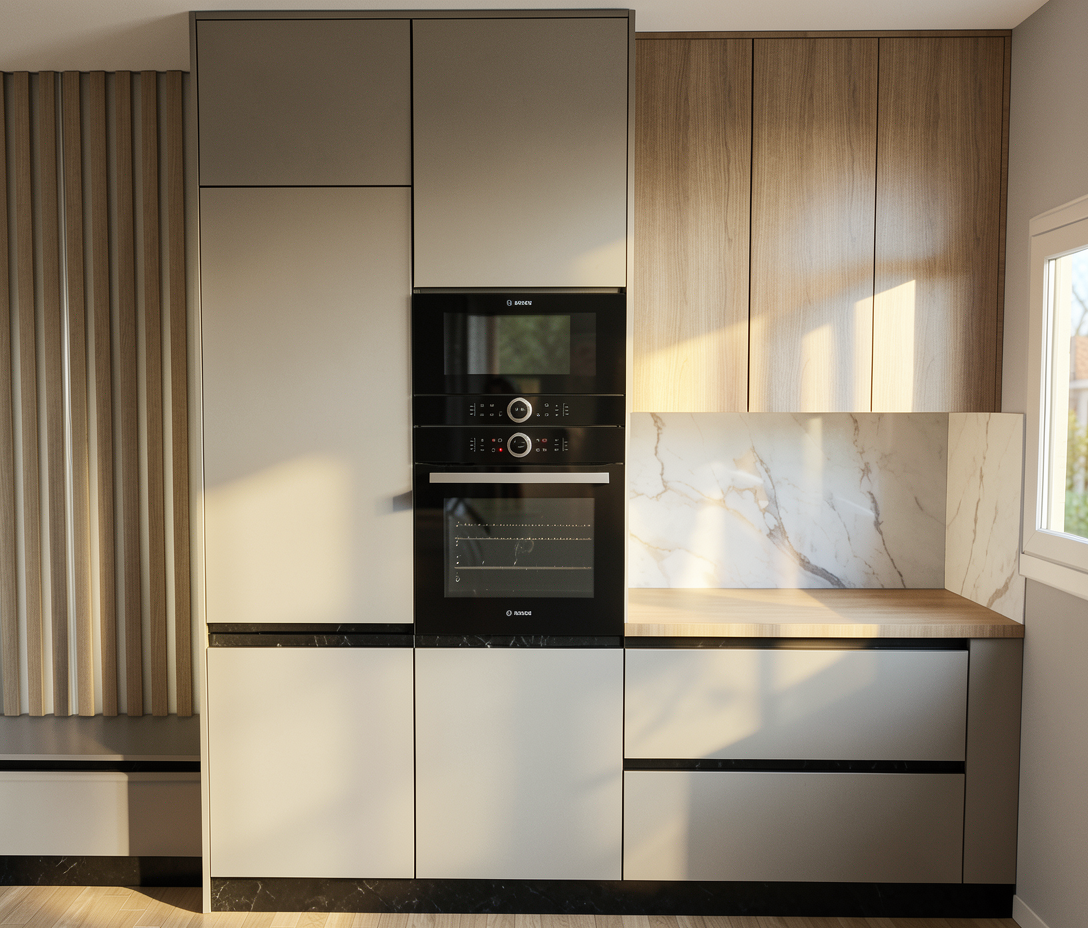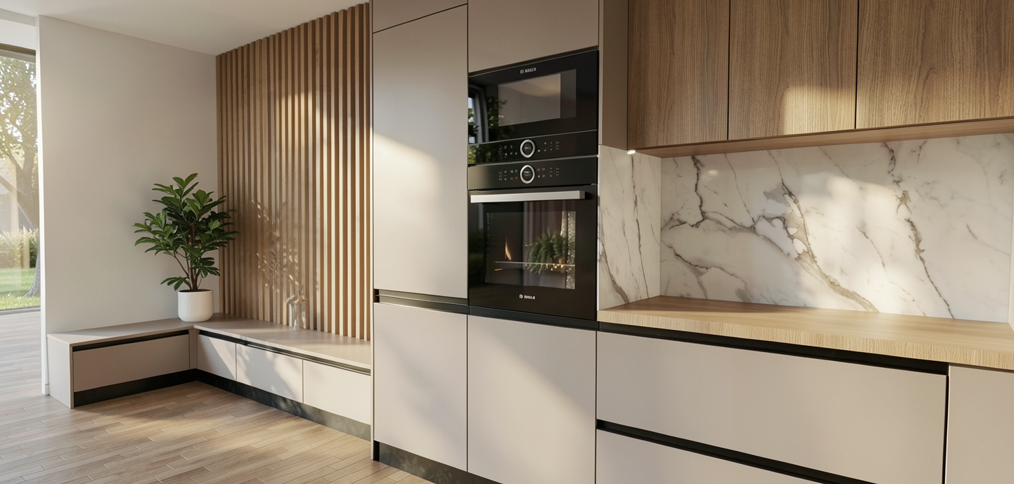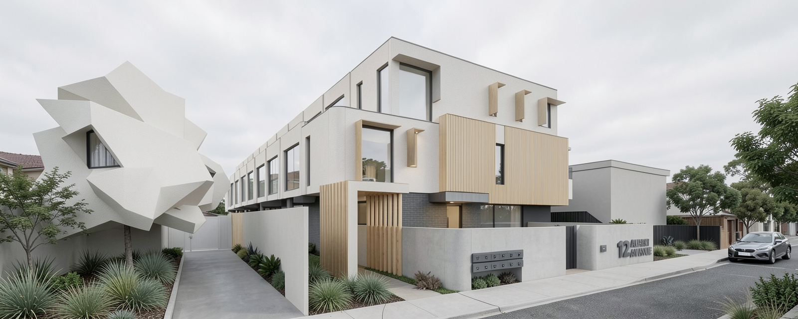 ultra realistic architectural render of a contemporary townhouse development use a refined neutral material palette ensure precise detailing such as clean joints shadow gaps and subtle material texture variation lighting set to soft overcast daylight with diffused natural light minimal contrast and balanced exposure avoid dramatic shadows create a calm professional and evenly lit scene contextualize within a clean suburban melbourne streetscape with restrained well maintained landscaping low grasses minimal shrubs and a few small trees keep surroundings tidy and uncluttered add subtle realism one modern parked car minimal signage clean driveway and pavement soft reflections on glazing no people or crowd slightly desaturated color grading high end real estate marketing style calm and refined composition photorealistic high detail 4k render professional architectural visualization quality