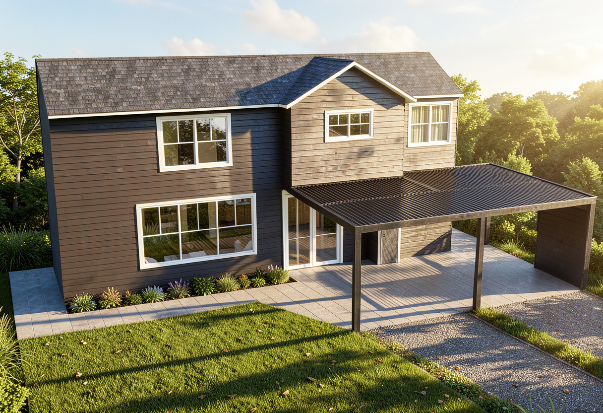 modernist exterior shot use the provided architectural model exactly as reference do not modify the architecture proportions or geometry material placement must match the design exactly material assignments garage wall natural stacked stone main house walls smooth beige stucco entry tower volume horizontal wood siding from bottom to top with no stucco interruption wall beside the front door horizontal wood siding roof fascia and trim dark charcoal metal garage door black framed glass panelsthe vertical entry tower must be fully clad in horizontal wood siding from the base of the wall all the way to the roof line no stucco should appear on this tower volume wood siding description modern horizontal cedar siding warm natural brown tone visible grain consistent board spacing subtle variation between planks explicit restriction no stucco on the tower no stone on the tower tower material is entirely wood siding stone description natural stacked desert stone only on the garage wall lighting bright palm springs midday sun with neutral daylight color balance environment palm springs residential neighborhood with desert landscaping agave plants gravel ground cover concrete driveway curb and asphalt street sky deep blue desert sky with thin wispy cirrus clouds camera professional architectural real estate photograph full frame dslr 35mm lens f 8 iso 100 rendering style ultra photorealistic architectural photography with realistic materials and subtle imperfections architecture