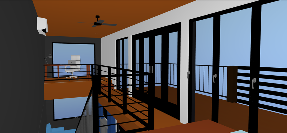 this is the bedroom left of a modern tiny home shot towards the front of the home where there is an elevated office loft over the living room on the front of the home there are large picture windows on both floors to the right are a set of tall windows and a black glass 4 piece bi fold door in between the sets of windows going out to the second floor outdoor deck the ceiling and floor are both a reddish stained walnut plank with the wall to the left being painted matte dark grey outdoors beyond the deck should be spruce and pine trees and the lighting should be golden hour