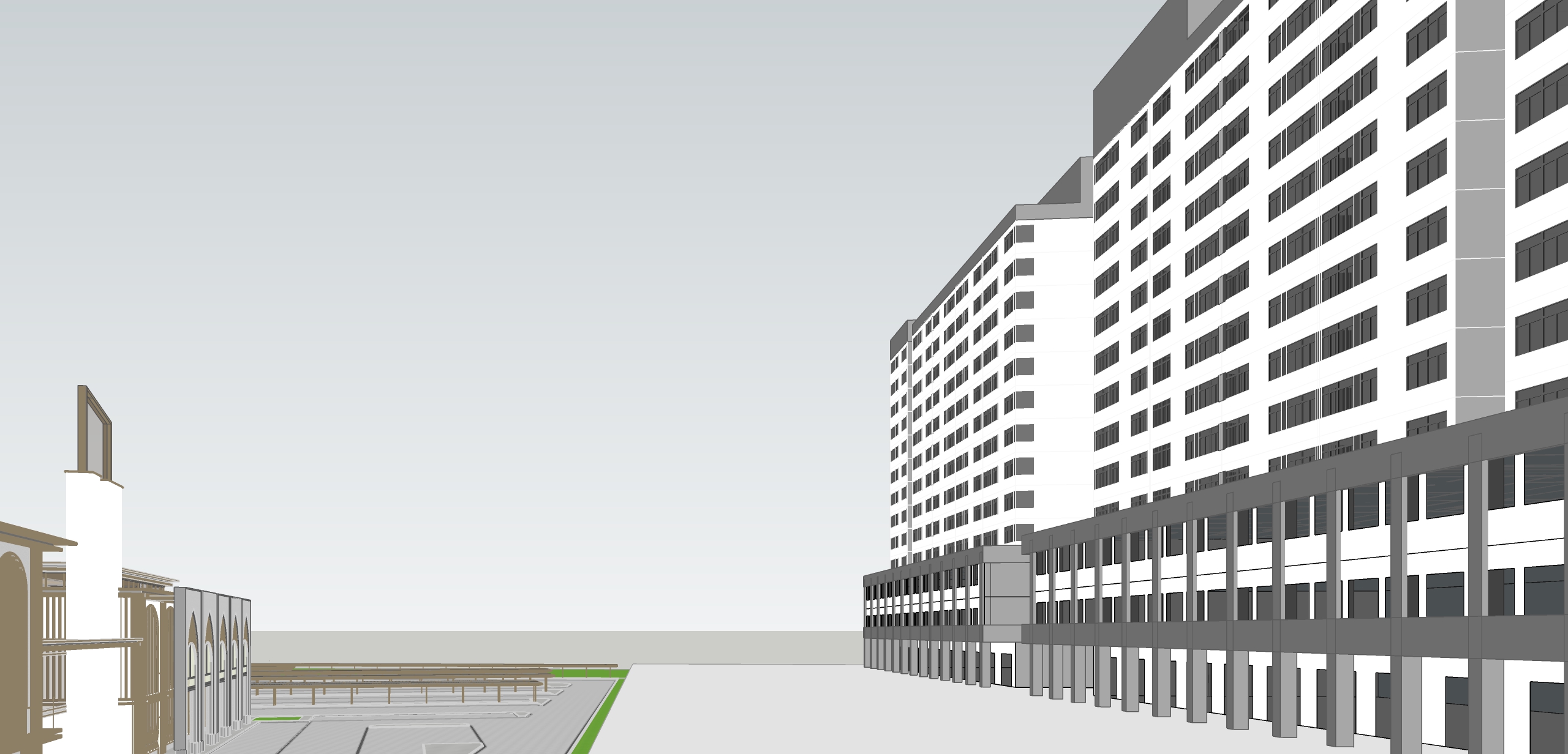 parking throughfare with family oriented activities in the centre modern attractive apartment blocks on top of retail and office spaces neghbouring lot on the left is a modern mosque with minaret render with realistic evening sky with warm lighting and landscape plants around architecture