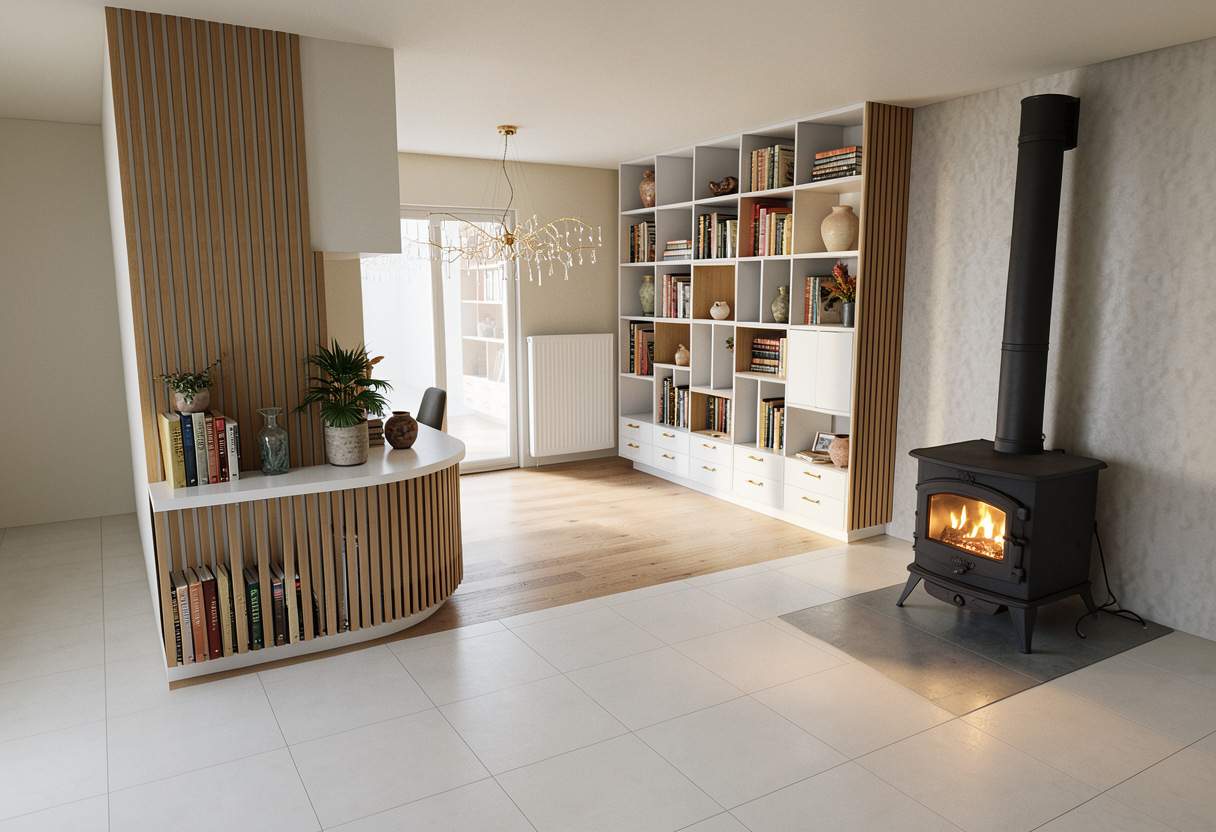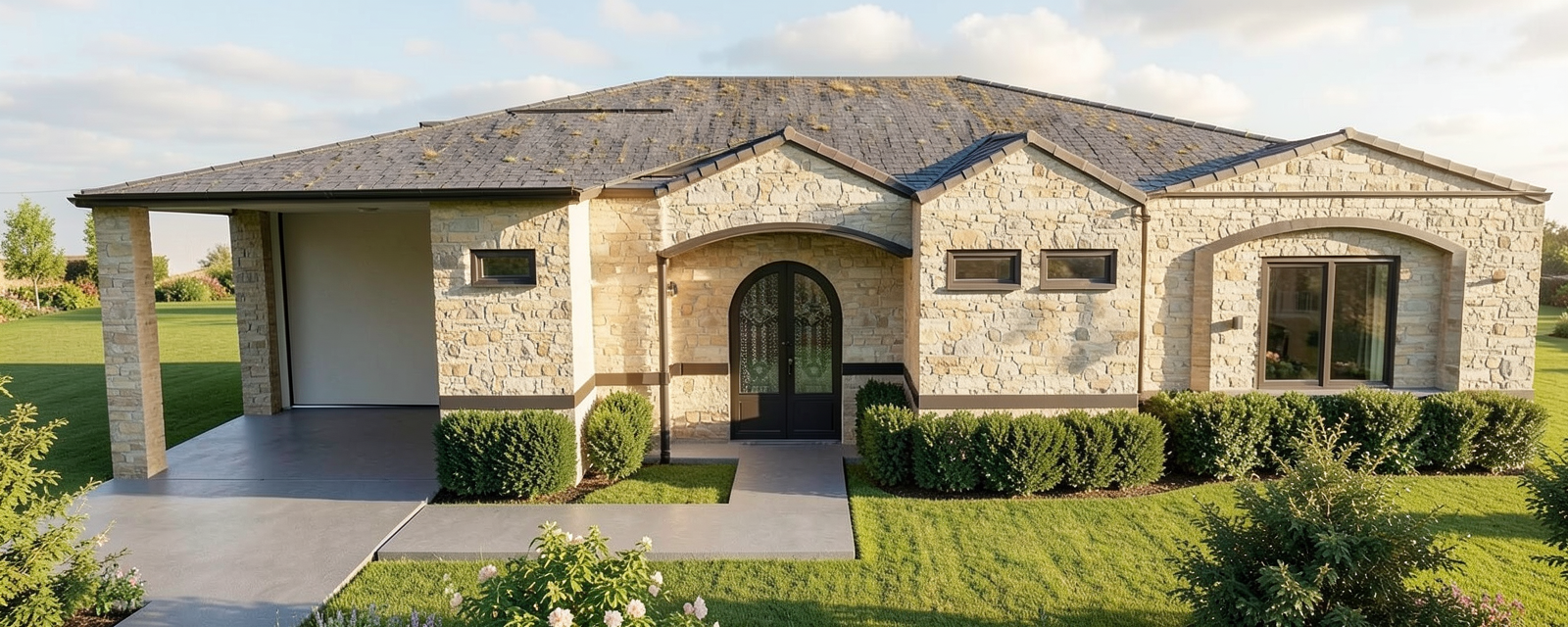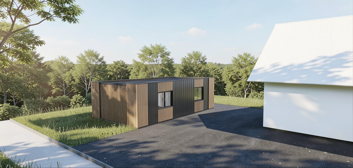 steel pavilon with wooden lamels elements on elevation and the white building natural daylight