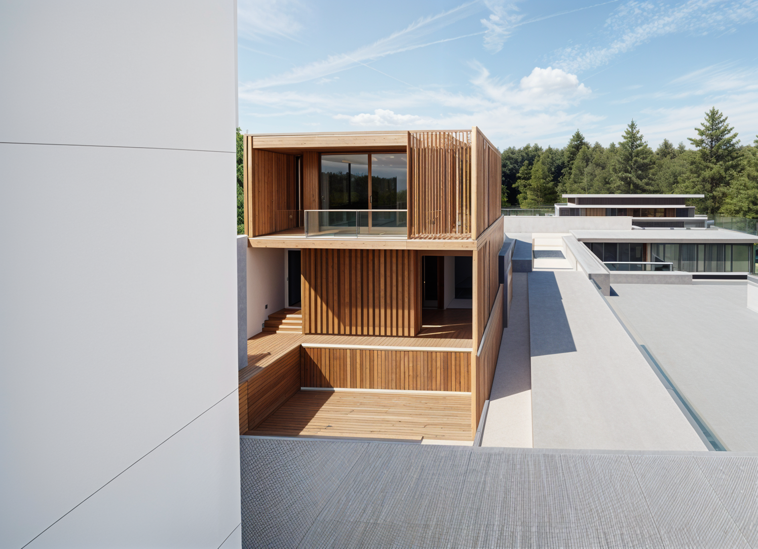modern farmhouse two story house front elevation with garages at 45 degress roof slate gray walls white with dark wood trim windows large with black frames deck wrap around door dark oak garage matching walls landscape xeroscape sky clear blue with soft morning sunlight overall atmosphere inviting cozy harmonious blend of modern architecture and nature