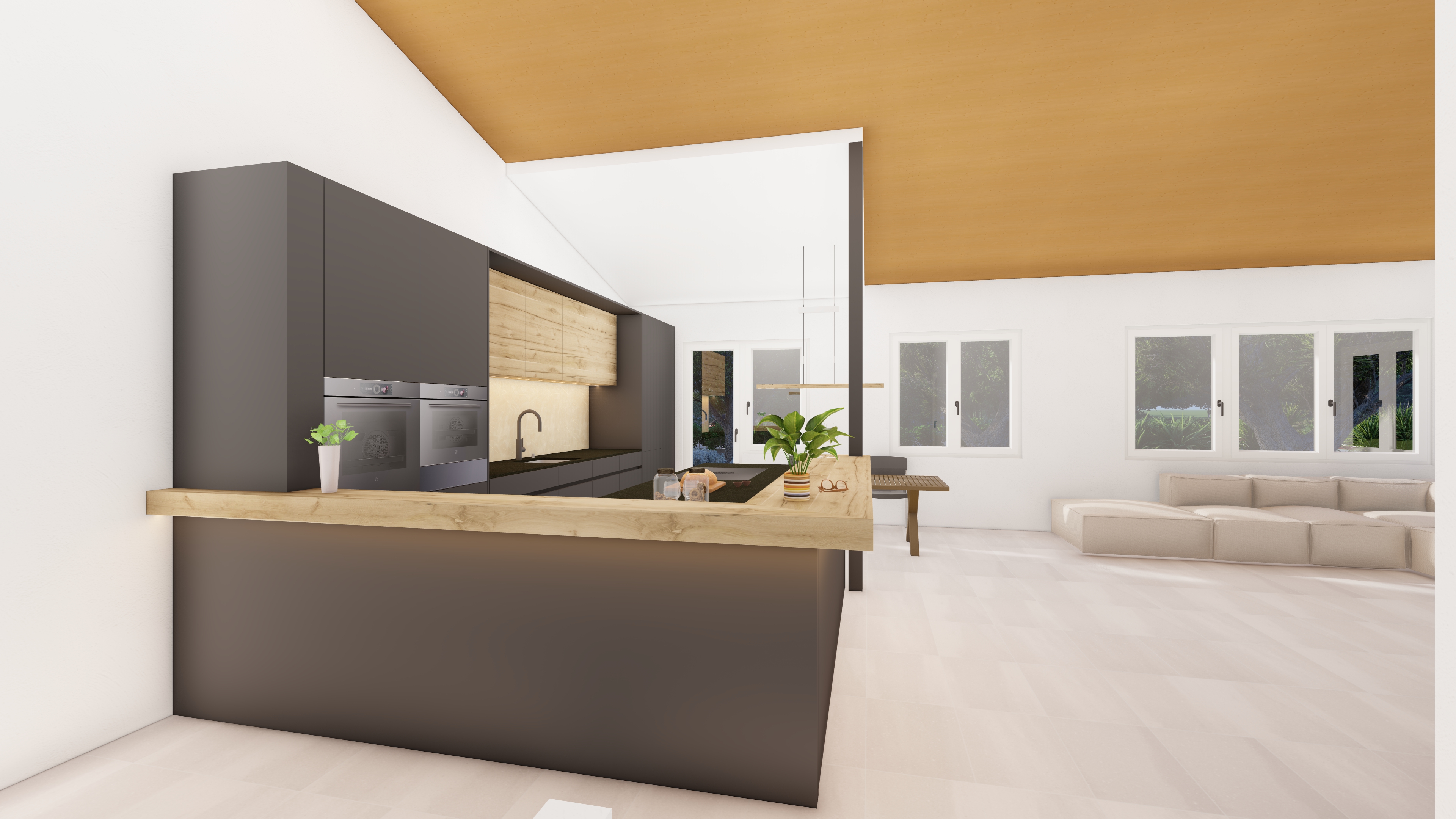 genau dieses rendering berarbeiten fotorealistisches innenraum foto exakt dieselbe perspektive und kameraposition wie das hochgeladene referenzbild 100 identische raumgeometrie exakt gleiche m belanordnung exakt gleiche verlegeart und richtung von platten wie vorlage exakt identische fensterpositionen mit gleichem ausblick durch die fenster weiches nat rliches tageslicht leicht schr g einfallende sonne durch die grossen fenster geschlossene r ume k nstlich ausleuchten sanfte realistische schatten blickrichtung ist nach osten sonnenlicht kommt von s den realistische materialien echte holztexturen stoff mit leichten gebrauchsspuren hochwertige oberfl chenreflexionen kleine gr npflanzen blumen in vasen auf tischen einbauen nat rliche farbwiedergabe leicht warme farbstimmung golden hour feeling das bild muss wie eine professionelle fotografie aussehen es soll ein echtes und reales foto sein canon eos r5 35 mm festbrennweite f 2 8 hyperrealistisch dslr qualit t raw aufnahme 8k aufl sung extrem scharf perfekte tiefensch rfe professionelle architekturfotografie