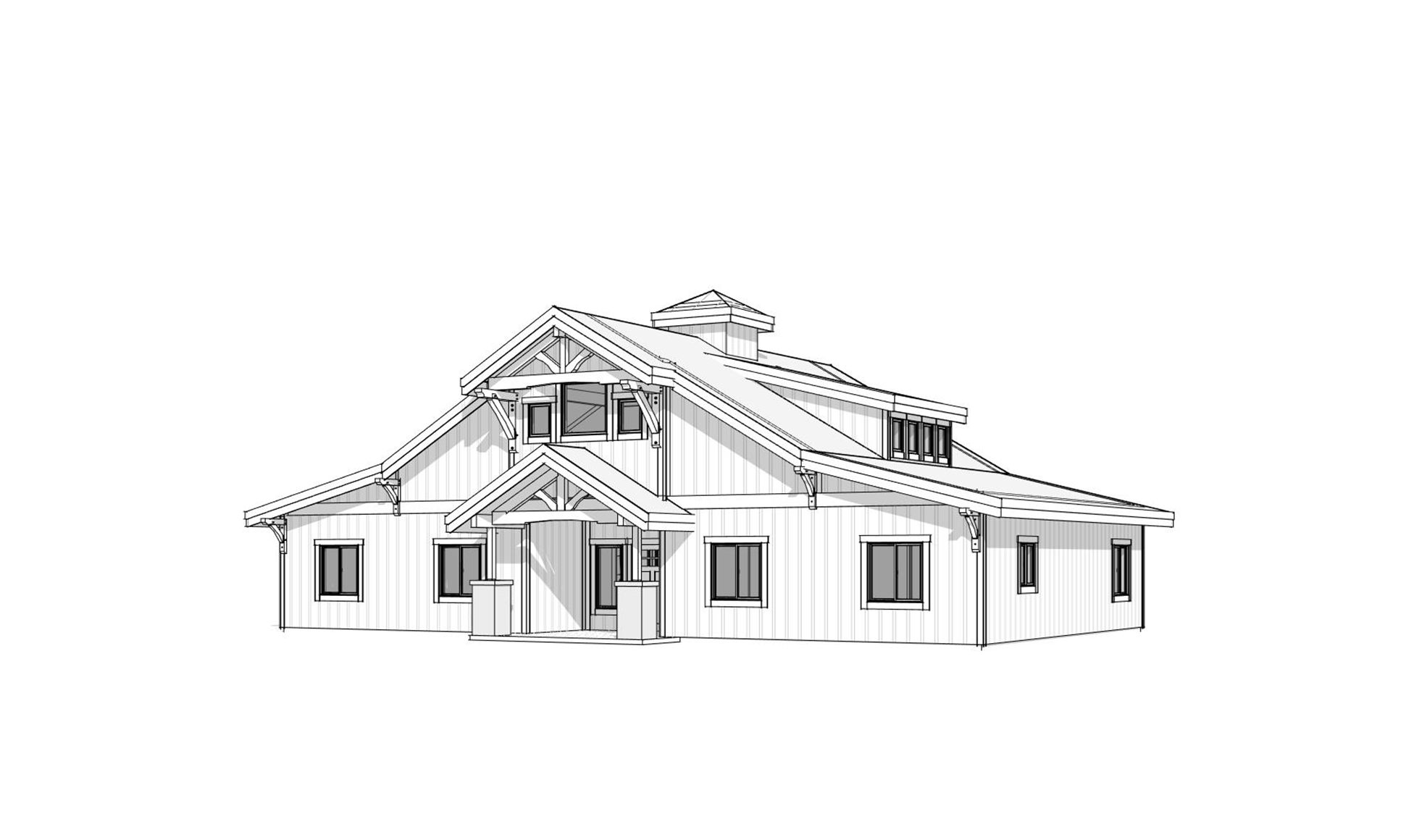 back view of a clean rustic barn home architectural exterior home rendered in cinematic golden hour lighting with bits of blue skies and sunlight coming through the clouds barn home in a lush beautiful montana countryside with green and yellow rolling hills and a faint hint of a mountain range in the far distance in the background warm glow and reflections off of the windows select grade vertical wood siding green manicured landscape around structure with gardens and patches of grass black standing seam metal roof high fidelity photorealistic visualization crisp shadow falloff refined facade geometry soft atmospheric depth premium architectural photography mood ultra clean composition and materials photorealistic render add black trim around the windows and doors prominent trees scattered around the property