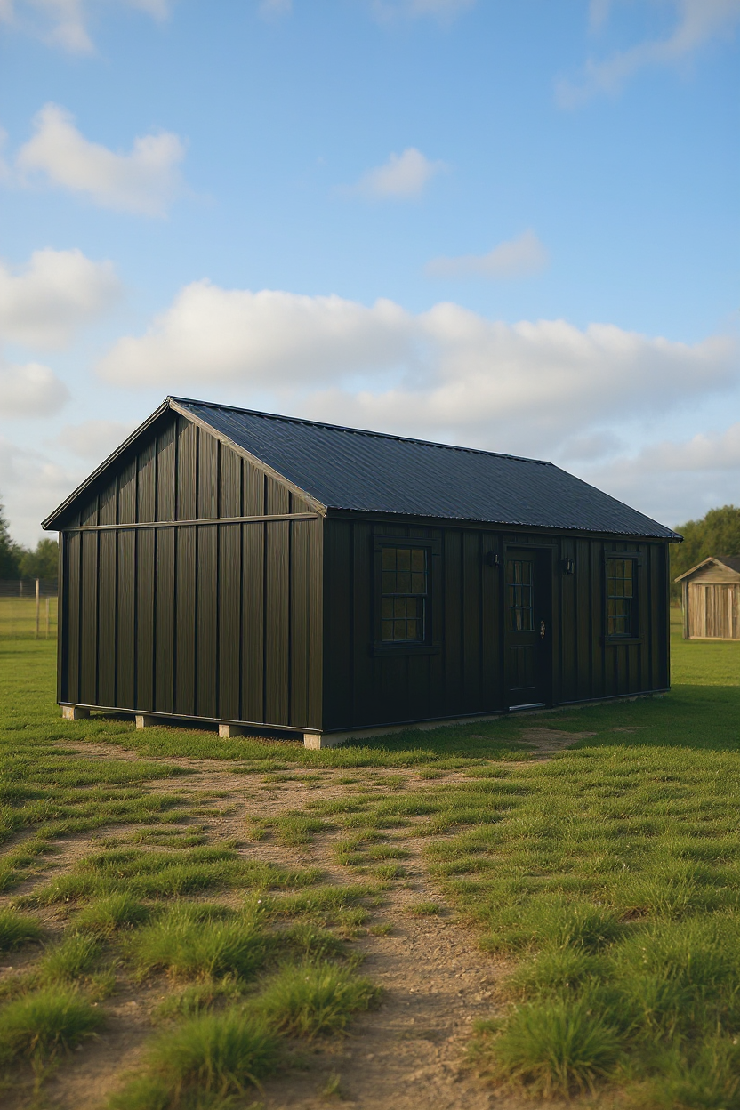 horizontal boards in woodtone lap siding and the remainder black board and batten
