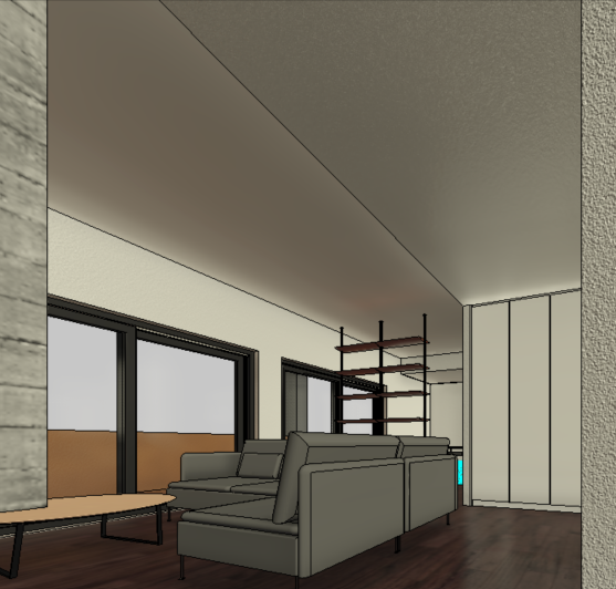 render a modern interior living room with a minimalist design walls in soft cream with subtle texture and a prominent feature wall in natural light gray wood the floor is a rich dark brown polished wood reflecting ambient light the ceiling is off white providing a clean contrast include large sleek black framed windows letting in natural light the atmosphere is warm and inviting with subtle shadows and a cozy contemporary feel