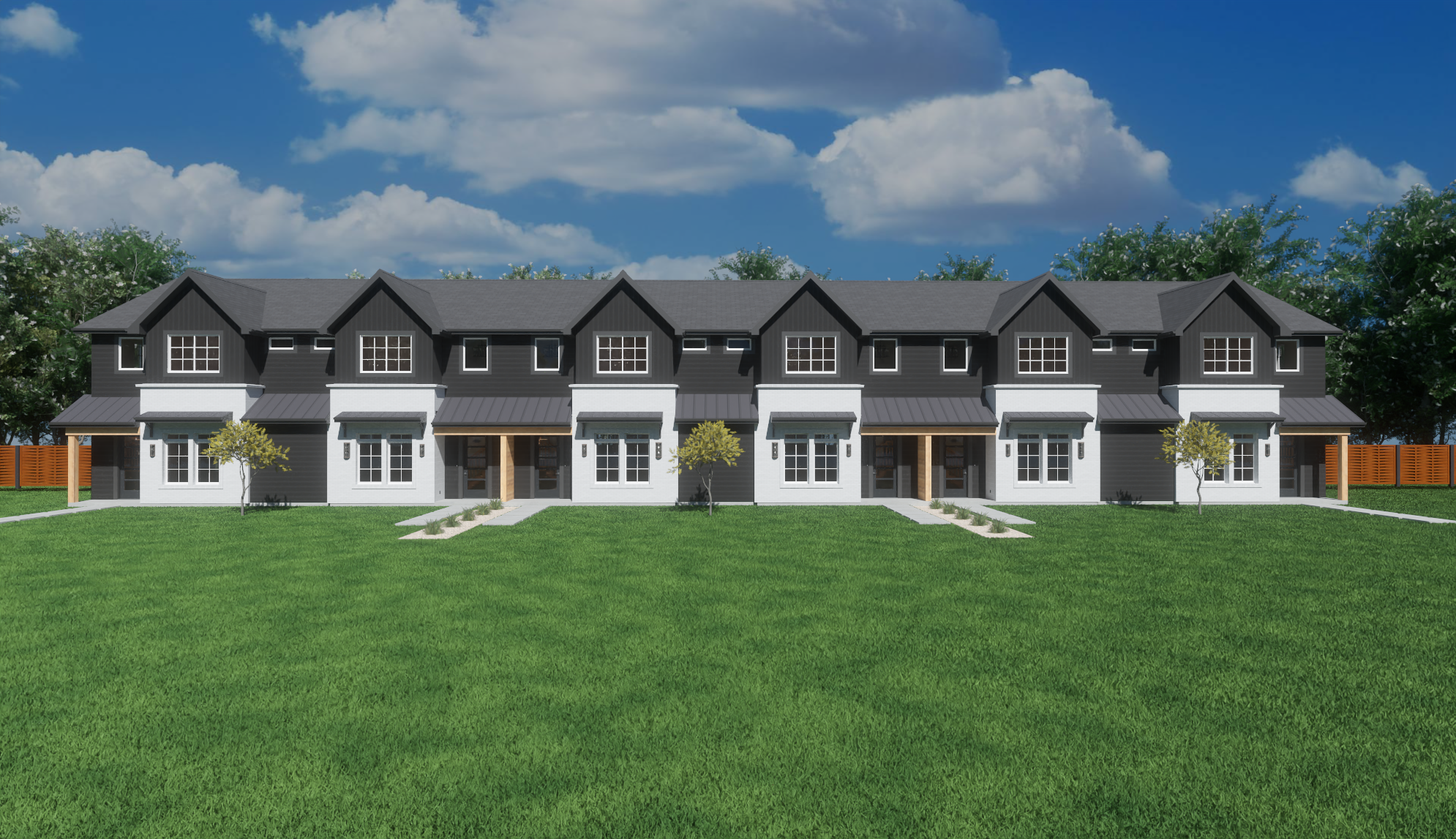make this more realistic enhance the materials daylight and airy atmosphere with clouds the lights are dimly visible through the windows the environment is central texas with trees and a residential fence