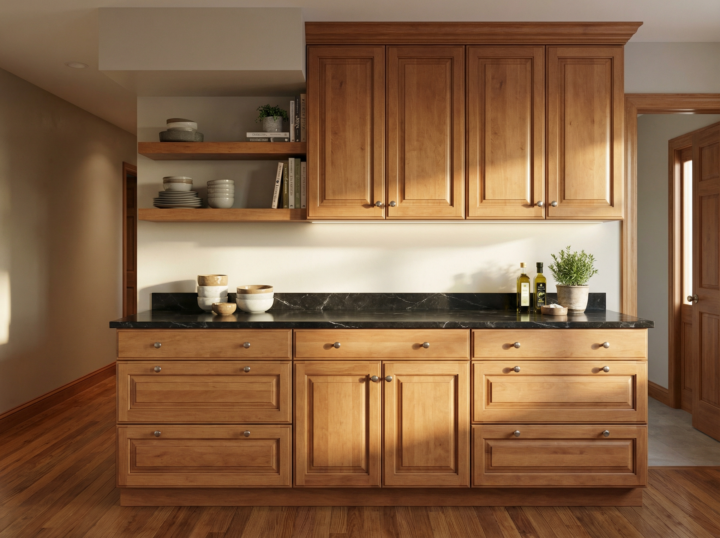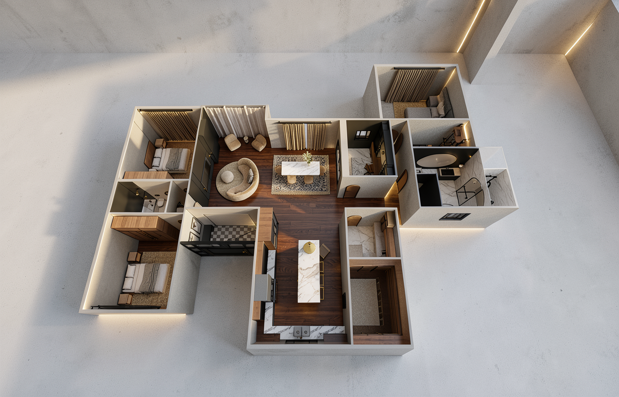 a hyper realistic 3d isometric cutaway of a luxury residence architectural digest style based strictly on the geometry of image 6 png the entire floor plan is unified by premium warm white oak wide plank flooring with a soft matte finish lighting is achieved through global illumination and ambient occlusion simulating a bright airy gallery with soft diffused top down daylight that eliminates harsh black shadows in the corners every room is detailed the living area features a cream boucl curved sofa the kitchen shows honed calacatta marble on the waterfall island and dark walnut cabinetry bedrooms include plush neutral linens and woven wool rugs bathrooms are rendered with micro cement walls and a large backlit circular mirror all interior walls are a crisp swiss coffee white catching the soft natural light high fidelity textures for wood grain marble veining and fabric weaves 8k resolution ray traced v ray style render clean architectural lines sophisticated neutral palette