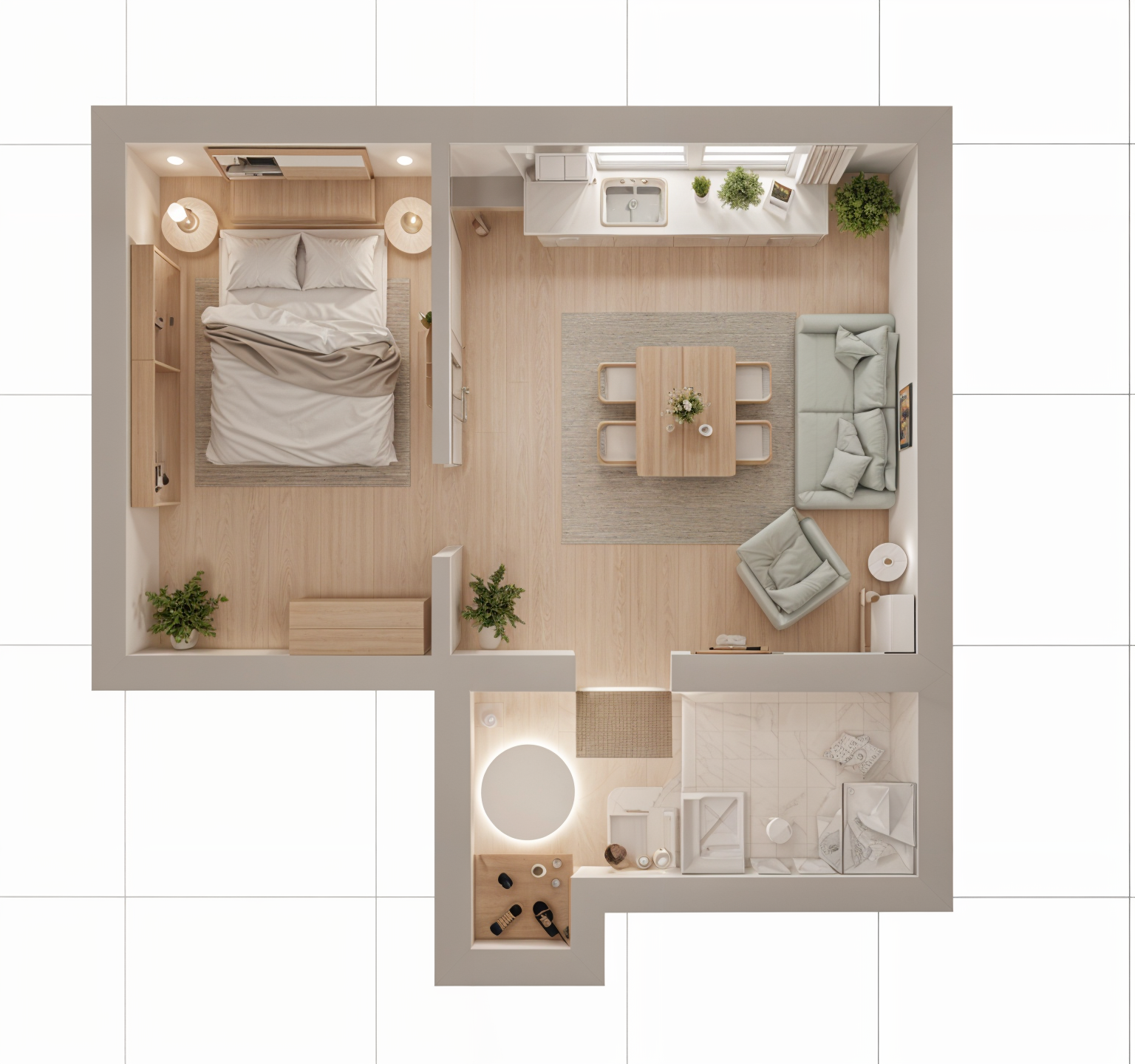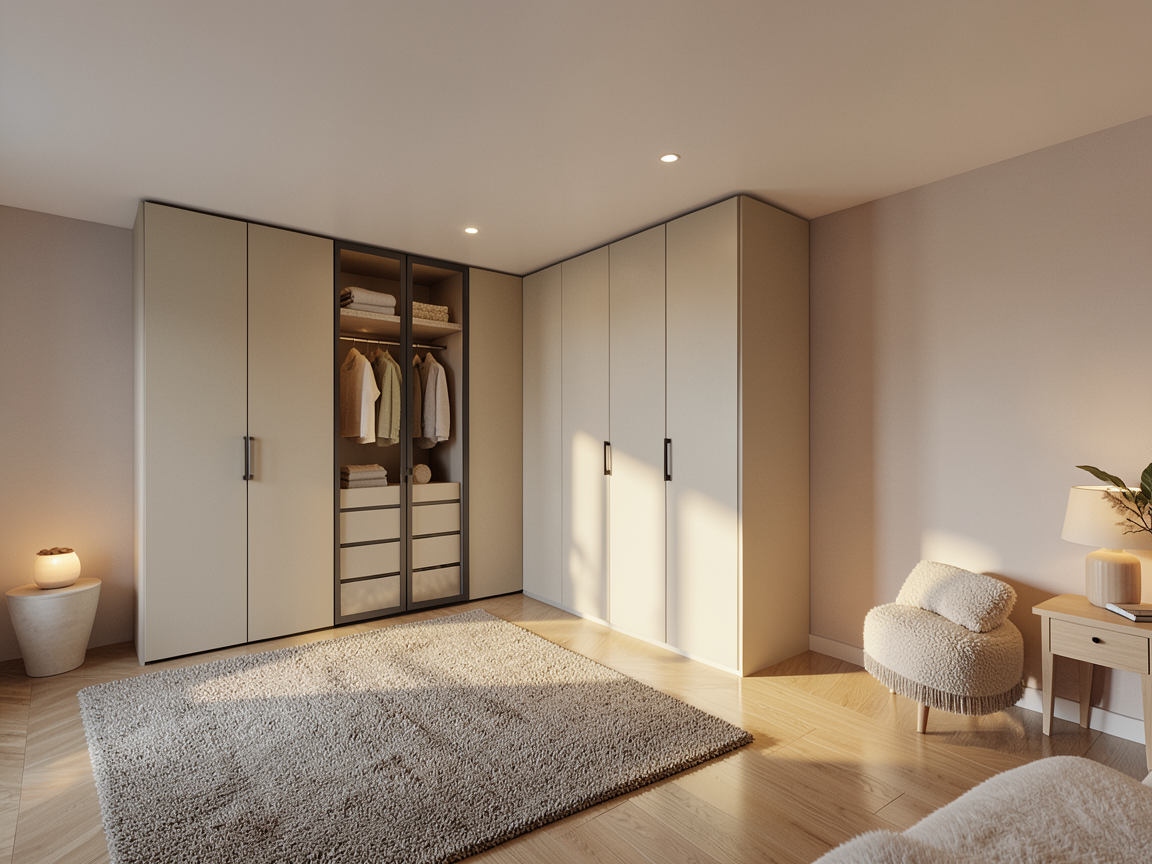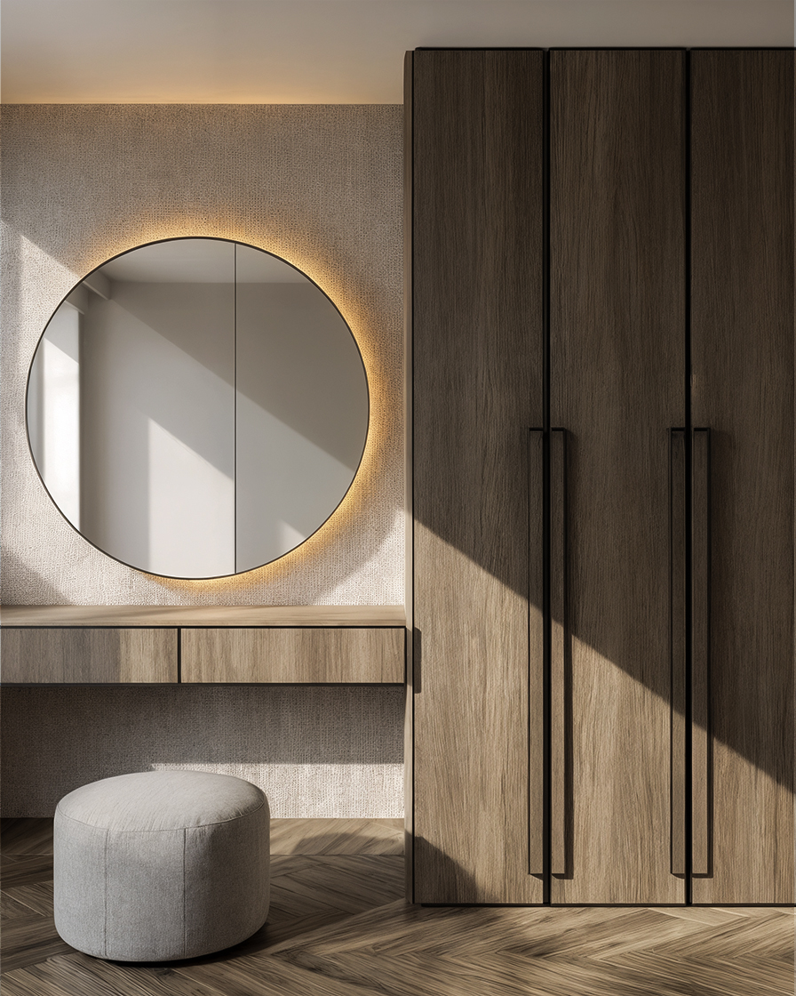 image type hyper realistic interior architectural render editorial style scene framing maintain exactly the same composition camera position proportions and elements as the reference image frontal view eye level camera approx 1 60 m neutral lens 35 50mm no distortion transformation day night key instruction convert the scene into a night interior atmosphere while preserving all materials geometry and composition lighting critical remove daylight influence completely eliminate the diagonal sunlight and shadows from the reference image main light source warm indirect ambient lighting soft and diffused coming from interior sources not visible mirror maintain and slightly enhance the warm perimeter backlight around the circular mirror it should become the primary focal light creating a soft halo on the textile wall additional lighting behavior very soft low intensity fill light to gently reveal materials wardrobe floor pouf no harsh shadows subtle gradients intimate atmosphere overall mood warm calm intimate evening interior no overexposure no strong contrast materials preserve exactly keep all materials exactly as in the reference image wood wardrobe vanity floor natural matte slightly reflective tactile grain textile wall warm beige soft and uniform texture mirror clean reflection now darker and more subdued due to night conditions metal handles matte dark finish pouf soft grey fabric slightly darker in low light color atmosphere warm color temperature approx 2700k 3000k muted tones slightly darker overall exposure soft shadows no crushed blacks elegant quiet editorial night ambiance style high end editorial interior photography minimal atmospheric intimate poetic and restrained quality ultra realistic high resolution physically accurate materials pbr clean global illumination adapted to low light conditions no noise no artifacts restrictions do not modify composition or materials do not introduce new elements or light fixtures do not create dramatic or cinematic lighting avoid excessive contrast or artificial effects