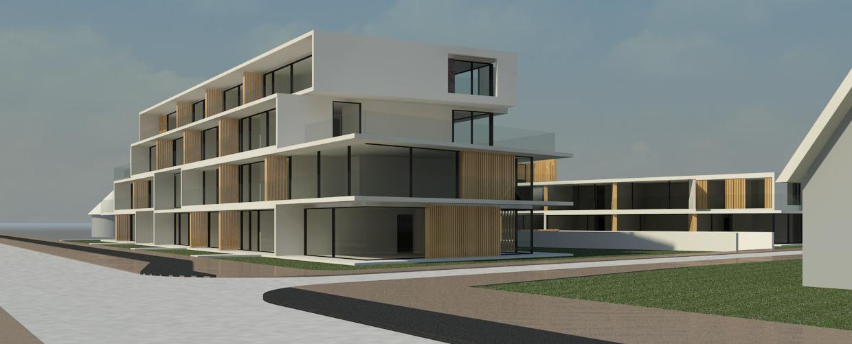 modernist exterior shot render with people a golden retriever a porch trees and flowers architecture