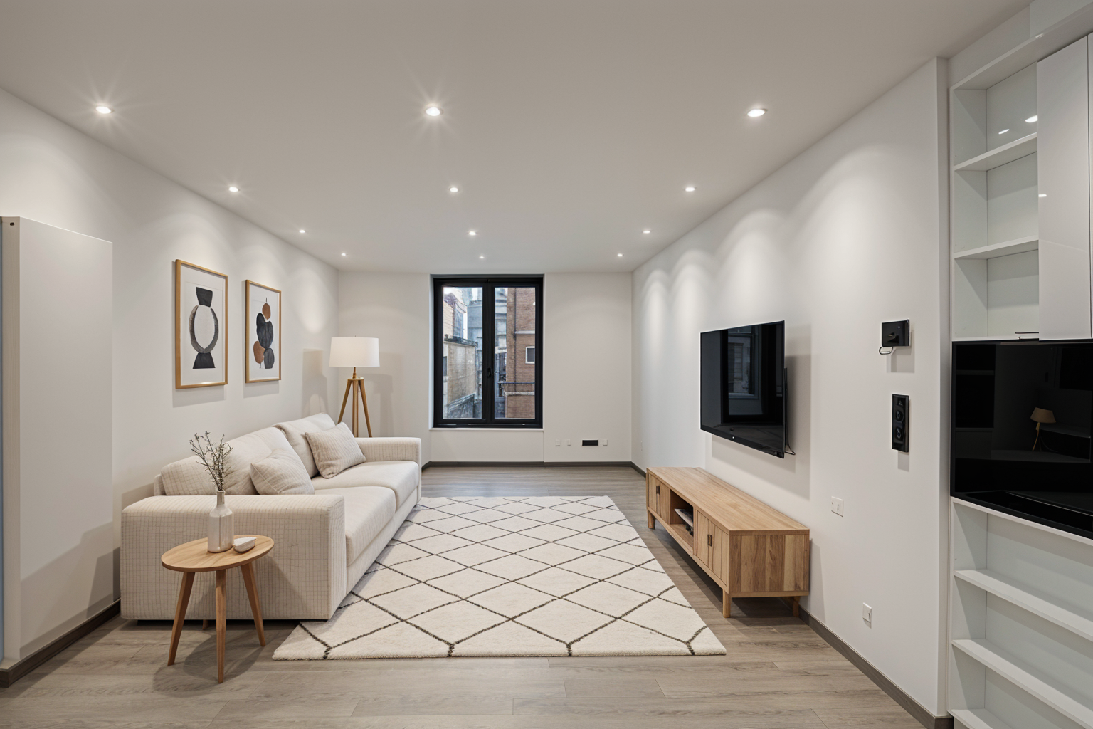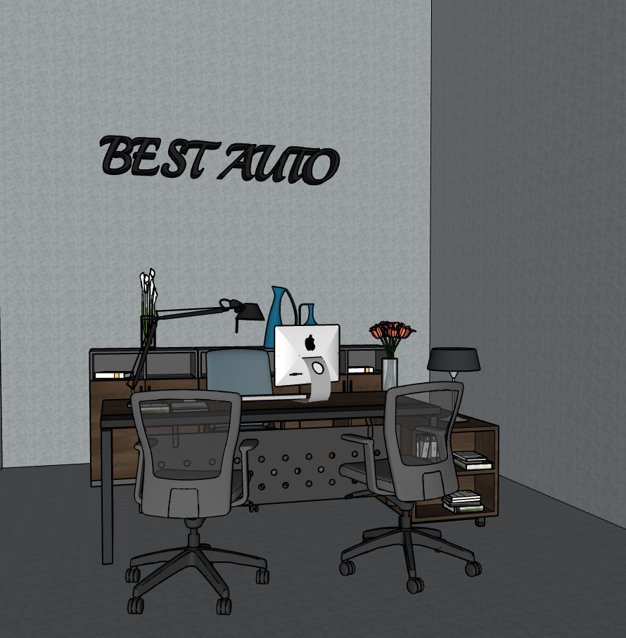 exterior shot render a modern office interior with a sleek minimalist aesthetic the walls are a soft light gray creating a calm and professional ambiance the floor is a darker gray adding contrast and depth a wooden desk with a rich walnut finish holds an imac with a silver casing and a contemporary black desk lamp two ergonomic office chairs feature a mesh back and are charcoal gray in color add decorative elements like a navy blue vase and a turquoise vase alongside a bouquet of vibrant orange flowers in a gray vase books are neatly stacked on the desk and side shelving in various shades of white and beige enhance the atmosphere with natural lighting that suggests a productive work environment