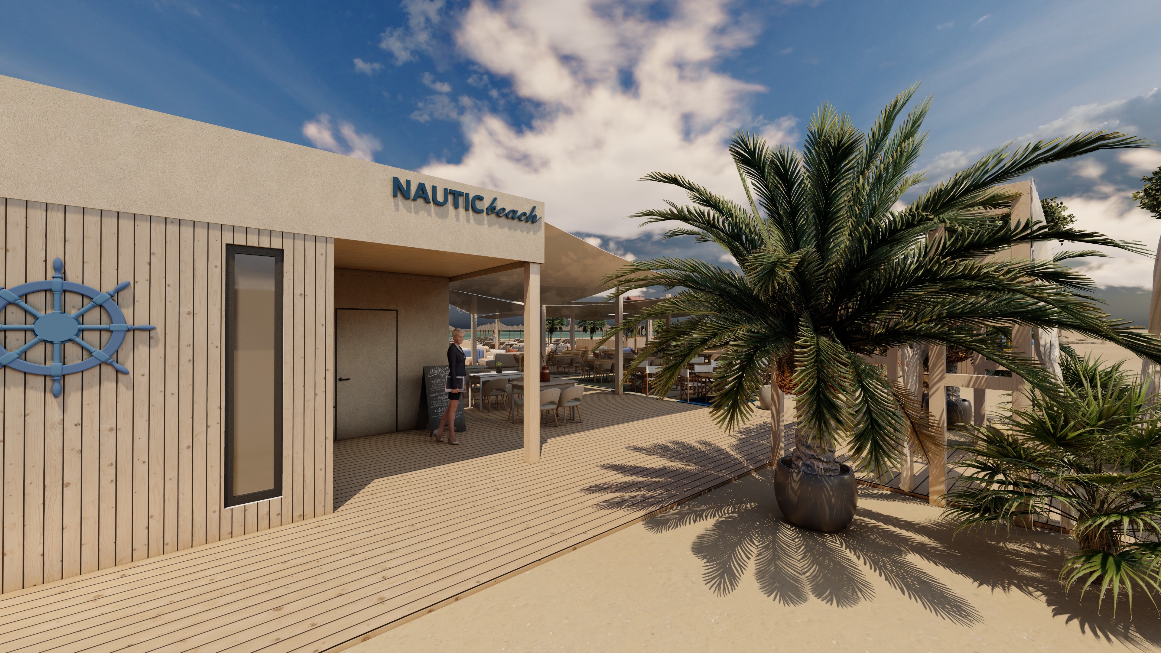 make the materials look more realistic for this beach scene do not change any structure or shape do not change materials keep the wood cladding as it is and the whitewashed wall cement as it is