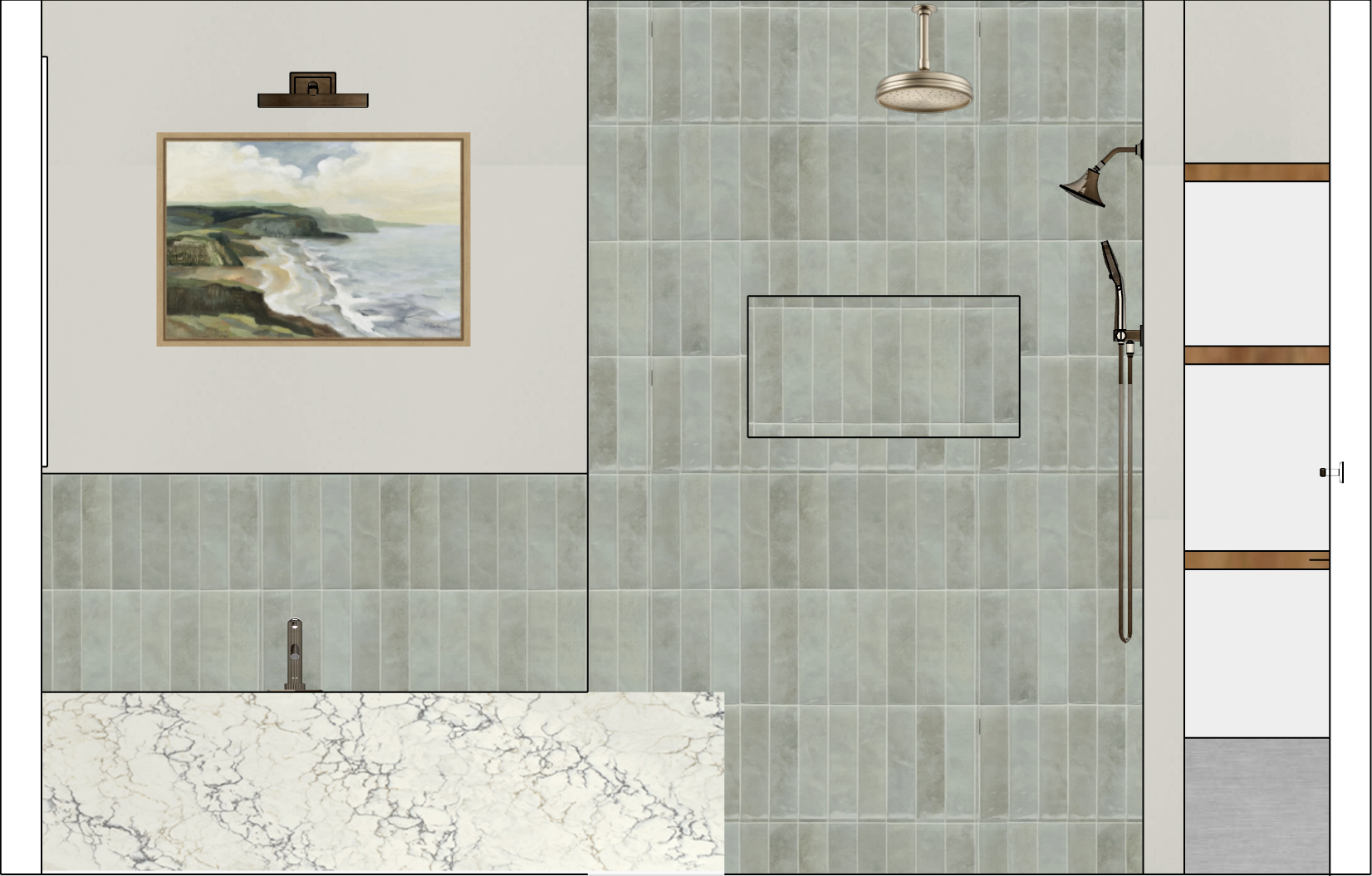 an ultra realistic professional interior photography render of a luxury master bathroom with a serene zen and oceanic aesthetic the large shower with glass doors is encased in oceanic tiles that continue around the bathtub the tub is an undermount tub within beautiful stone that continues into the shower as a bench above the tub is hanging art with an accent library light above offering a soft glow there is a shower niche that holds soap bottles there is an open linen closet behind the shower to hold rolled up towels a window on the other side of the room allows natural daylight to pour in casting soft realistic shadows and subtle light gradients across the room the lighting feels calm and organic like early morning coastal light the overall atmosphere is peaceful spa like and uncluttered evoking a luxury coastal retreat shot with a professional full frame dslr camera 35mm lens shallow depth of field ultra high resolution sharp focus realistic reflections accurate material rendering and true to life color grading hyper detailed cinematic realism natural imperfections global illumination ray traced lighting editorial interior photography style