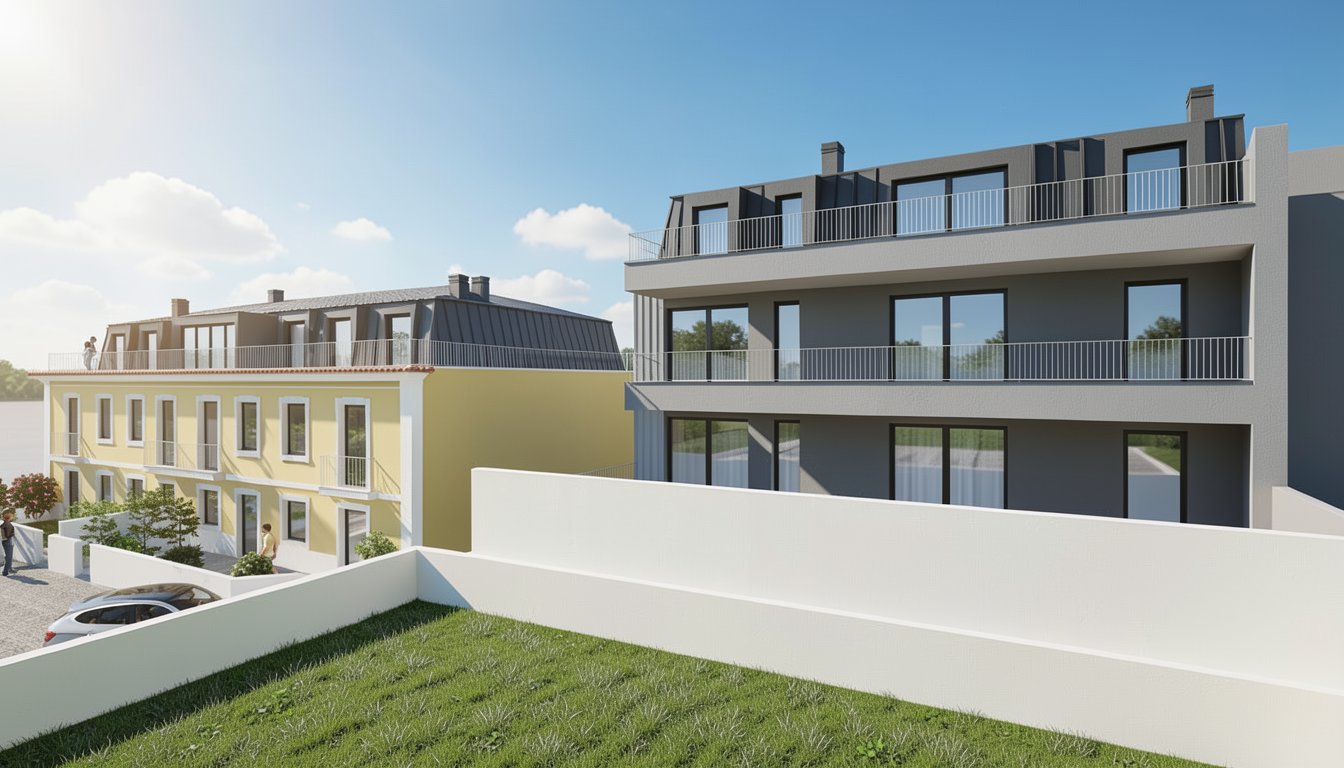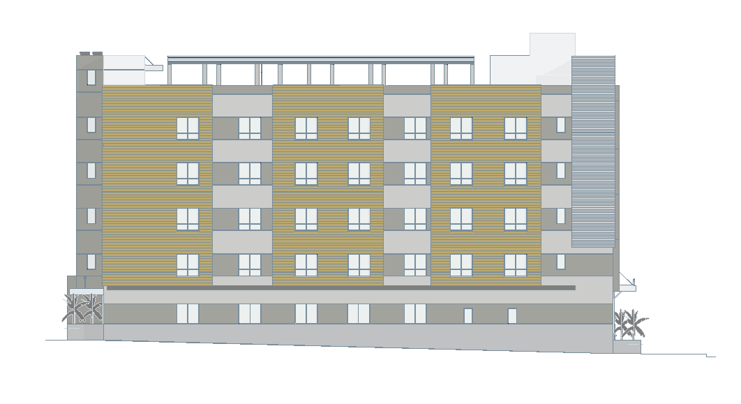 exterior shot side view of a grey plaster building with wood siding and stone on the first floor with vegetation on the front and back