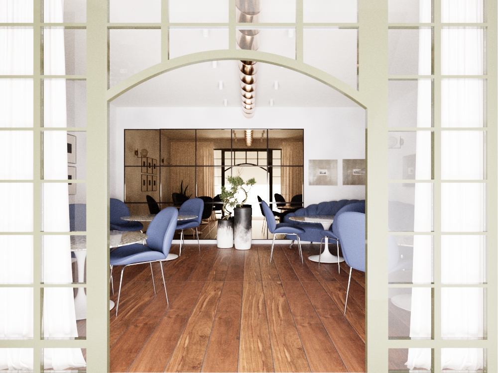 use the provided image as a fixed base and maintain exactly the same geometry proportions layout and camera position do not modify architectural elements furniture design or overall composition walls must appear in a warm tone not white refined and elegant enhancing the warmth and intimacy of the space improve only realism and render quality enhance textures material depth reflections shadows and light interaction while preserving the original color palette chairs and sofa upholstery must be ultra photorealistic velvet the velvet must appear soft deep and tactile with rich texture visible fabric grain and subtle natural sheen avoid flat plastic or glossy appearance show realistic light absorption gentle highlights soft shadows and slight tonal variations typical of real velvet fabric preserve exactly the same color shape and proportions of chairs and sofa improve only material realism wall mirrors must have a vintage inspired amber mirrored finish with warm reflections subtle patina and softened reflectivity creating a refined and intimate atmosphere tables must be styled with an elegant fine dining table setting including refined plates and premium glassware suitable for a luxury restaurant dinner service the styling must be minimal curated and perfectly balanced sophisticated never cluttered add subtle material imperfections and micro variations typical of high end handcrafted interiors softened edges slight irregularities and non uniform reflections lighting night dinner atmosphere the environment must feel like an exclusive evening dining experience in a luxury restaurant overall lighting should be warm soft and enveloping with controlled contrast and gentle shadowing add soft and warm light to the ceiling spotlights aligned along the existing metal ceiling pipe providing refined accent lighting without drawing attention wall lamps must emit a warm diffused glow that enhances materials and creates a cozy intimate ambiance avoid harsh flat or overexposed lighting lighting must feel cinematic elegant and natural enhance depth perception and spatial layering while keeping the original camera position unchanged the final image must convey exclusivity comfort and timeless luxury