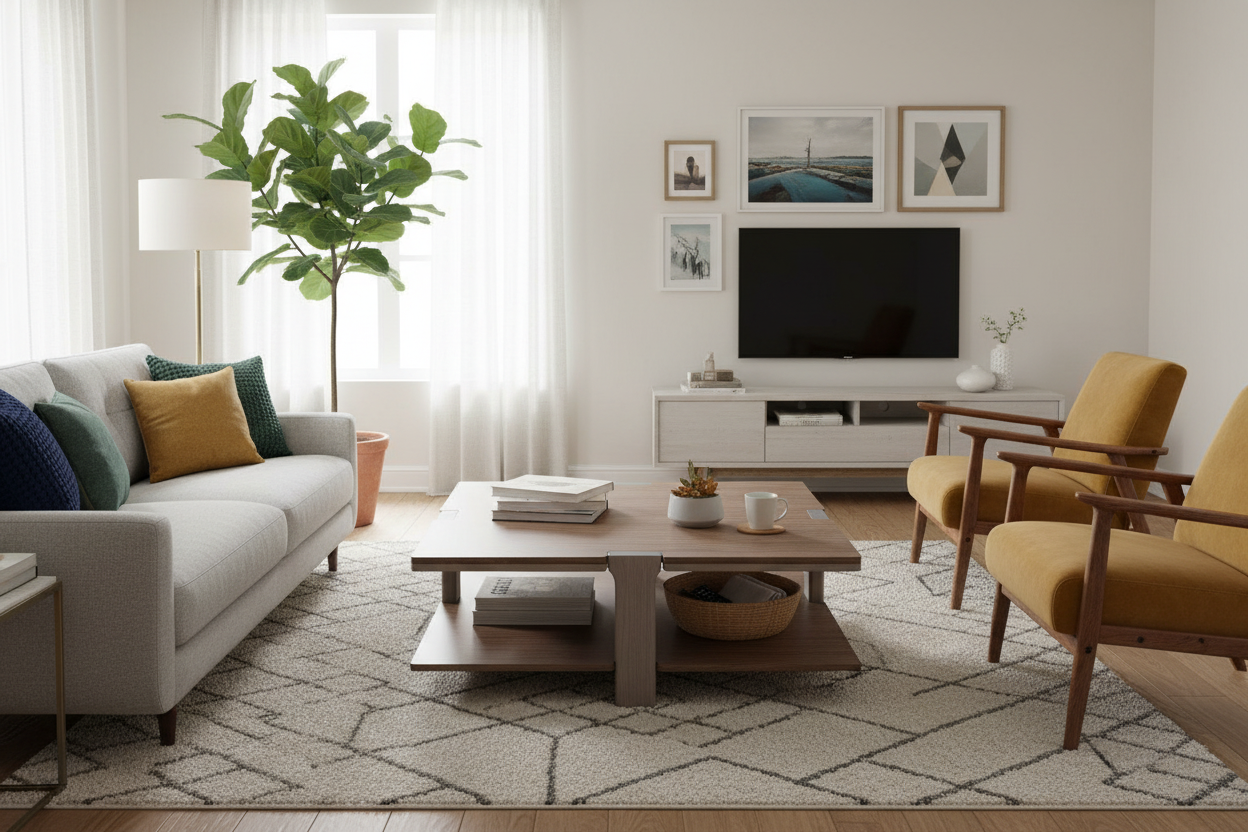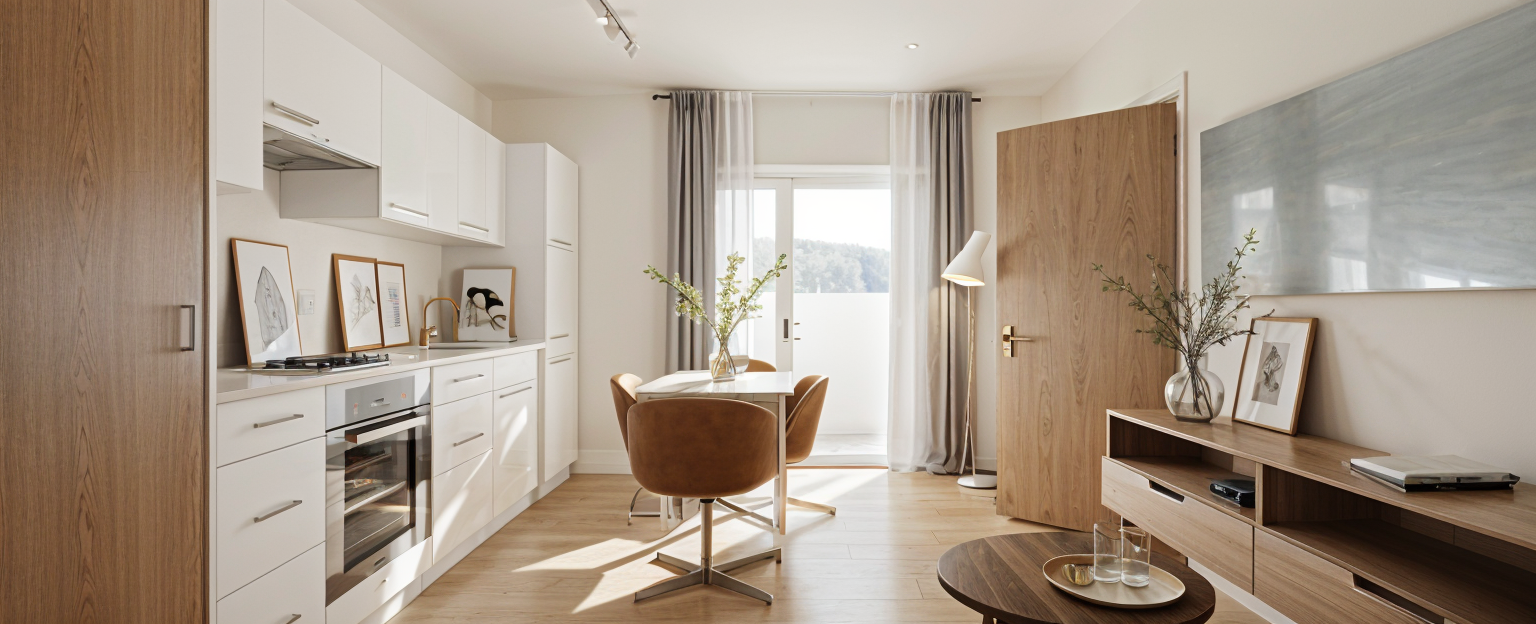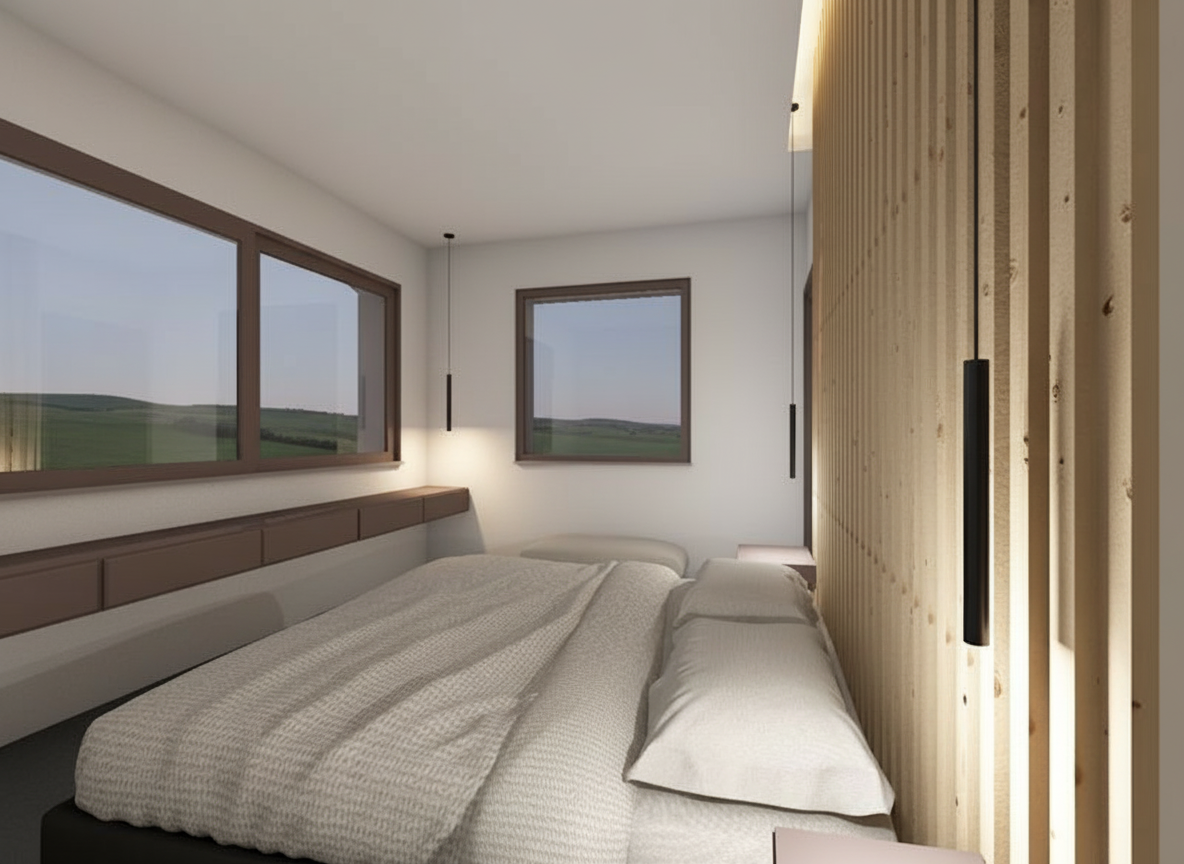 create visualization from the human eye height features a central rectangular building building 2 story 8 5 meter high commercial building planned on the northern part of the plot most of the commercial building s facade is modern glass windows surrounding the building neatly aligned parking spaces in light gray and lush green areas with small trees adjacent roads in soft brown tones bordered by forested areas with vibrant green foliage residential neighborhood with houses in muted pastel tones and earthy brick hues the atmosphere is serene and organized with natural and urban elements in harmony textures are crisp colors vivid and the lighting captures a peaceful sunny day ambiance