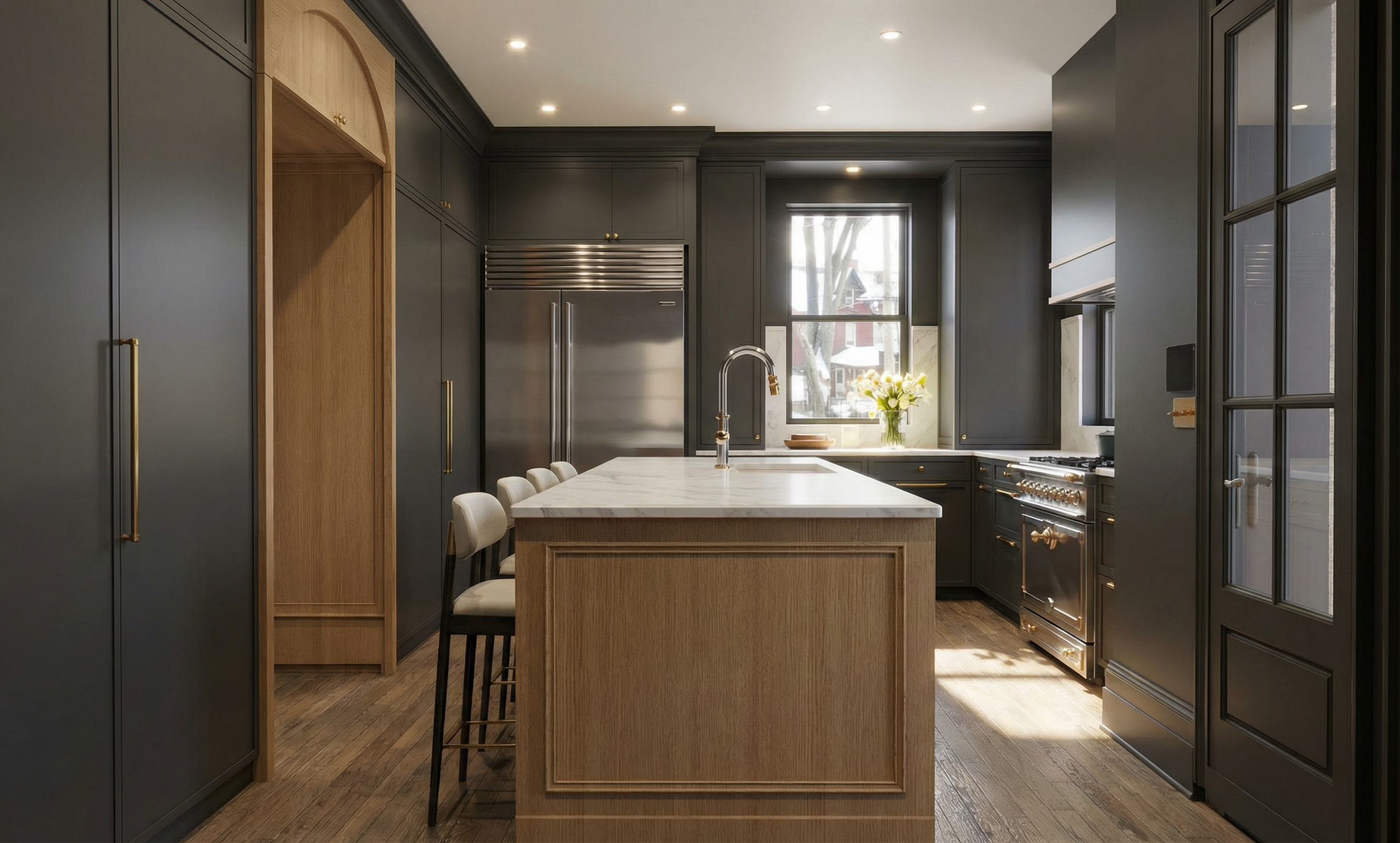reduce window size change the open shelving here to upper cabinetry with glass doors