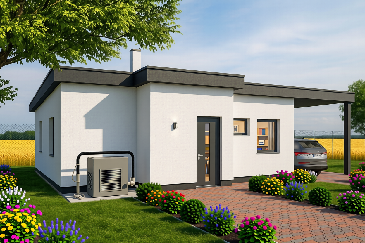 p idej vlevo od vstupu tepeln erpadlo s vy st n m doleva uprav zahradu za domem a je del posu ploty o 10 m sm rem dozadu a za zahradou vykresli pole s p enic vykresli staging do oken vykresli detaily typu sv tidla kliky u dve atd p idej do pop ed mladou jablo r ov ke e a lu n kv t vykresli iv plot br nu se zd n mi sloupky d l c pozemek od silnice s uprav dla bu na barvu p skovou roz i obr zek na form t 16 9
