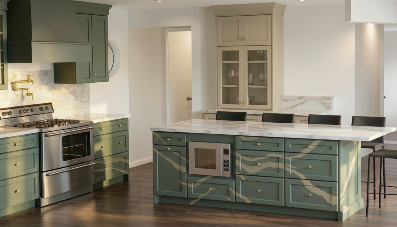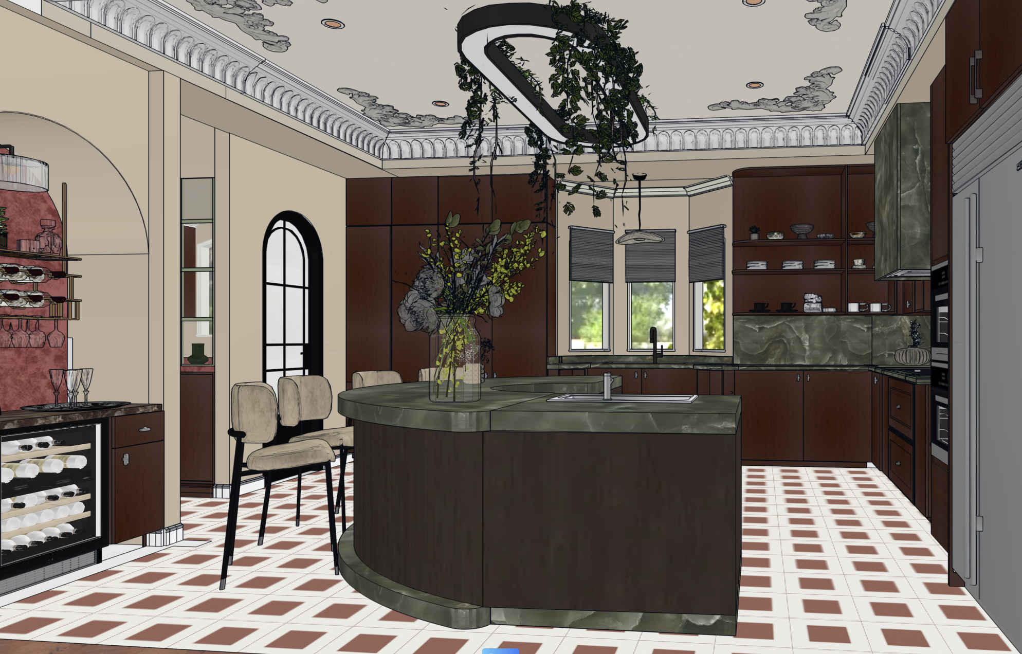 photorealistic luxury kitchen interior bright natural daylight balanced exposure rich dark wood cabinetry curved island with stone countertop continuous under cabinet led strip lighting a single seamless light line under upper cabinets soft warm glow illuminating backsplash only no segmented lighting no individual lights per cabinet no light on island no under lighting on the island controlled lighting realistic light falloff all ceiling lights and wall lighting turned on layered lighting global illumination dslr 35mm ultra realistic