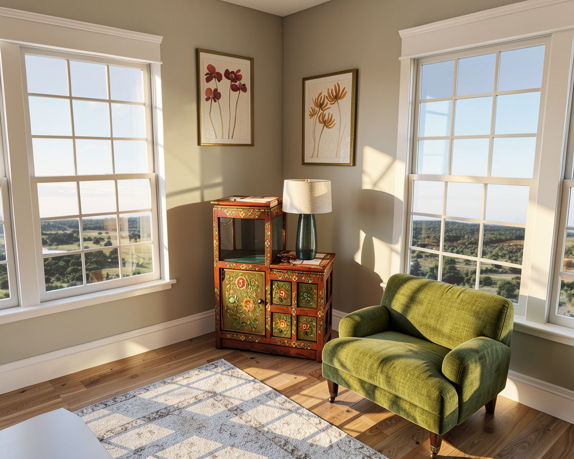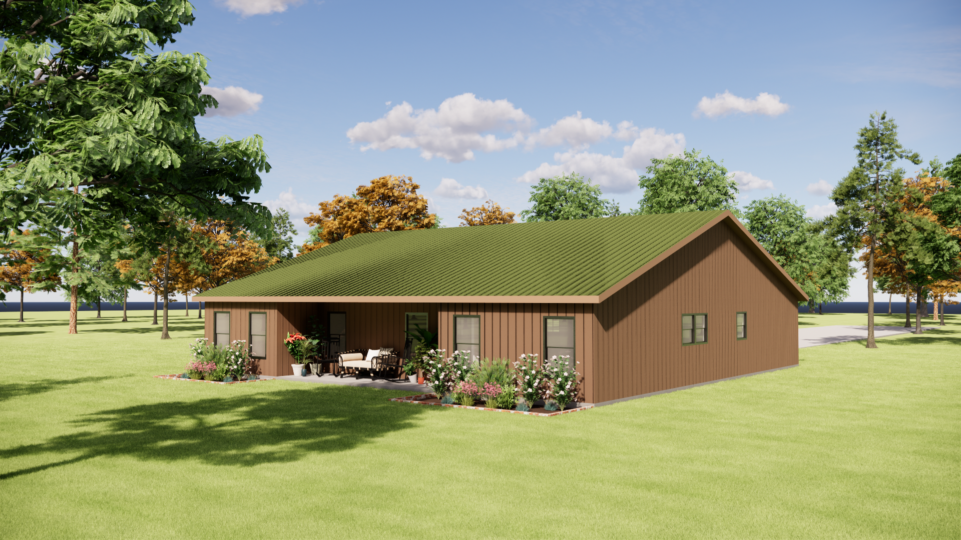 you are a professional image renderer you create the highest grade renderings around and specialize in architectural renderings this is the front elevation of a house create a high resolution photorealistic image of this structure keep the windows as they are where they are keep the doors as they are where they are keep the main structure as it is where it is feel free to change the perspective keep the roofline as it is where is it do not add anything to the structure that i have not asked for the roof is forest green metal architectural style the siding is metal medium brown in town the background will be a pastoral north texas farm it should be early afternoon with a bright sunny day clear skies the landscaping should be summertime with plenty of color