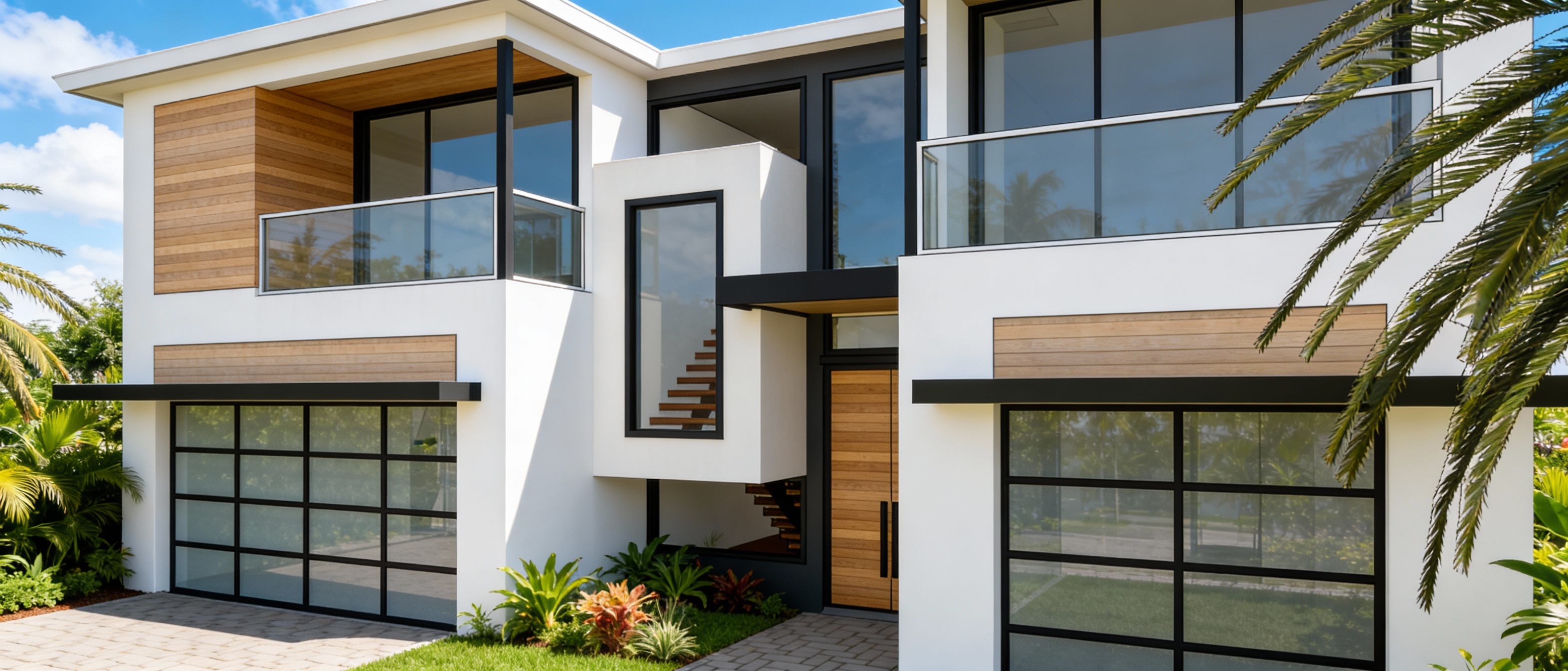 a traditional colonial featuring pastel siding white trim the roof is a dark charcoal color adding contrast windows reflect the clear blue sky the front doors are stained mahogany w glass panels surrounding the house a lush green lawn with colorful flower beds in shades of pink lavender and yellow the atmosphere is serene and welcoming with soft sunlight casting gentle shadows