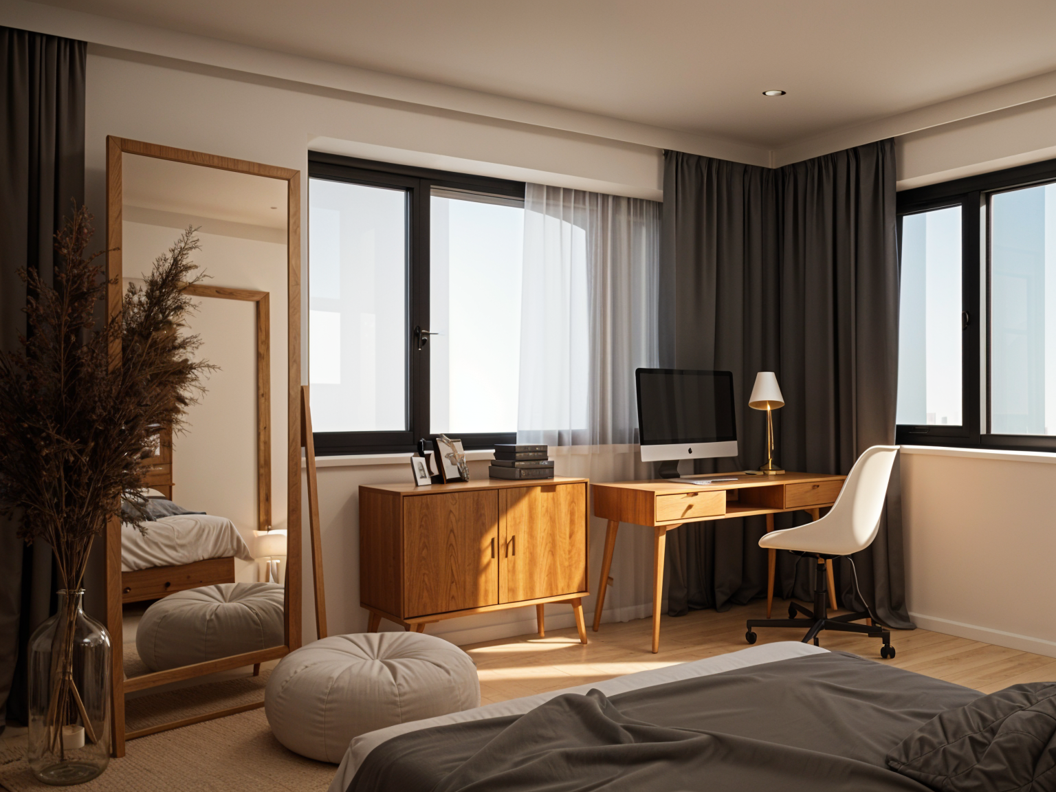 redesign the facade in a modern natural style combining warm oak wood panels and light beige stone cladding add slim aluminum window frames and subtle decorative trims instead of traditional moldings use indirect architectural lighting under roof lines and between vertical elements include minimal landscaping such as planters or stone borders to enhance the entrance zone architecture
