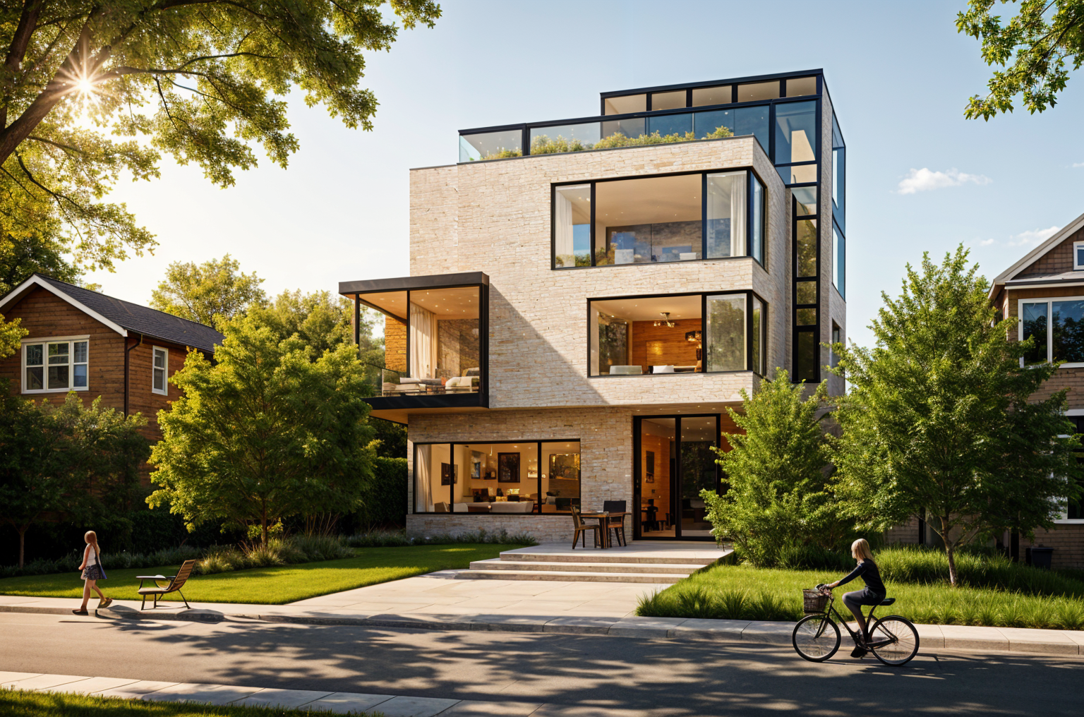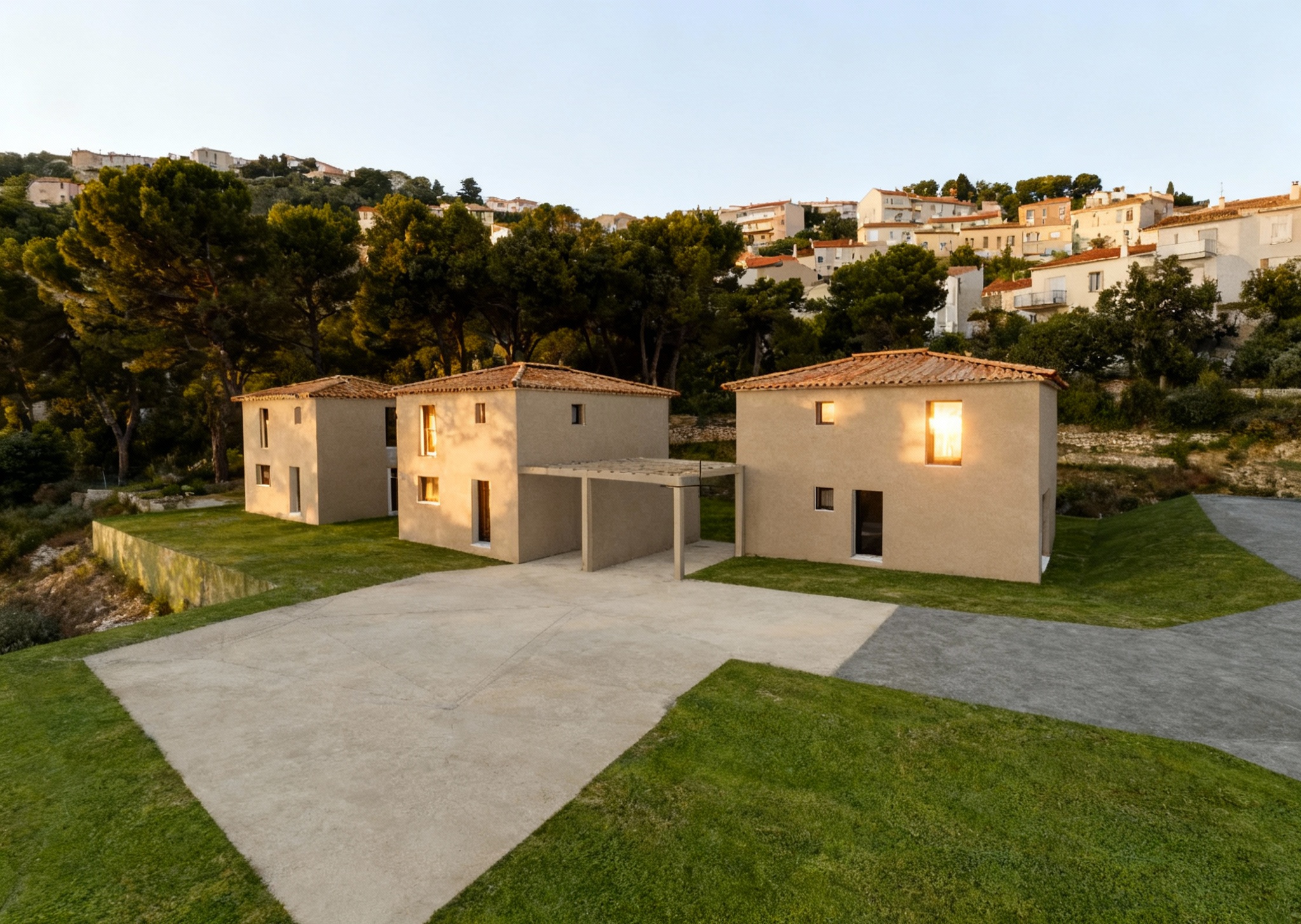 lot of sunlight and reflects in the windows houses of marseille in the background with lot of trees more houses in the background my point of view