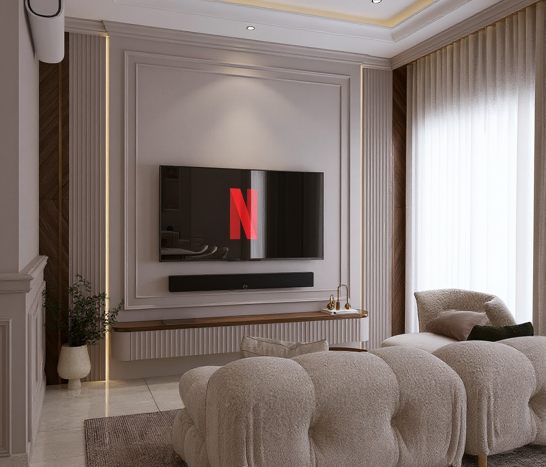 add small size subwoofer to the right and left side on tv table