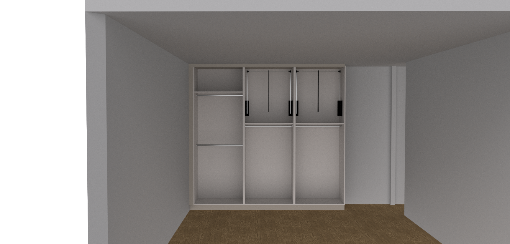 a spacious modern walk in closet with sleek minimalist design the closet features floor to ceiling shelves and hanging rods in a soft dove gray color the floor is a rich warm walnut wood adding contrast and depth the walls are painted a subtle calming light gray creating a serene atmosphere overhead soft diffused white lighting enhances the space accentuating the clean lines and organized layout the overall ambiance is contemporary inviting elegance not to change the arrangement of the internal spaces of the wardrobe but to place the necessary clothes