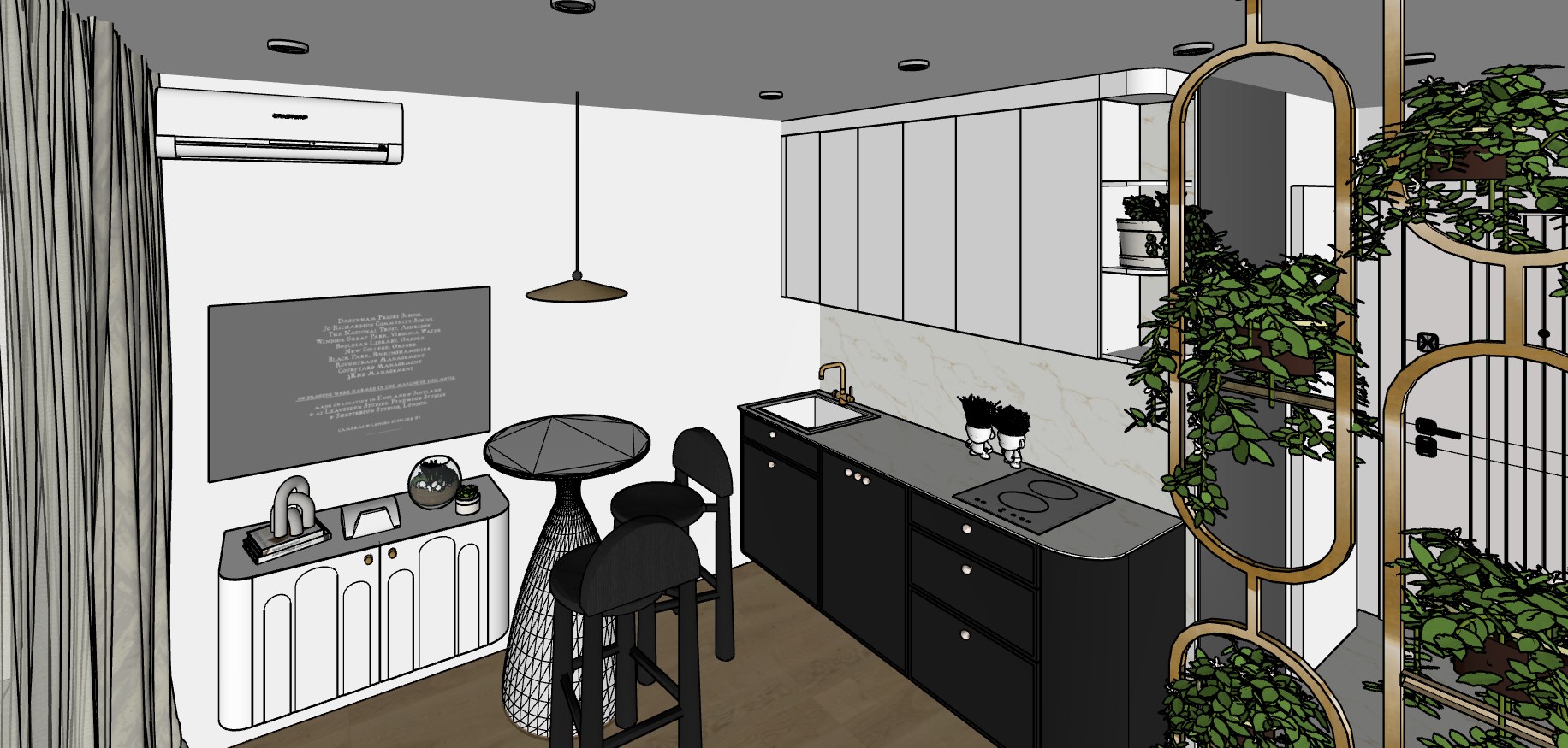 render a modern kitchen interior with a minimalist aesthetic the atmosphere is warm and inviting the cabinetry is sleek and black with a matte finish complemented by brass handles for a touch of elegance the countertop is a soft gray marble with subtle veining harmonizing with the white upper cabinets featuring a glossy finish add a circular kitchen table with an intricate black wireframe base include two black high chairs with cushioned seats enhance the space with a hanging pendant light featuring a brushed brass finish the flooring is rich dark wood providing a warm contrast to the white walls on the right incorporate a vertical garden with lush green foliage framed by elegant brass arches the ambiance is cozy and sophisticated with subtle lighting to create a serene atmosphere
