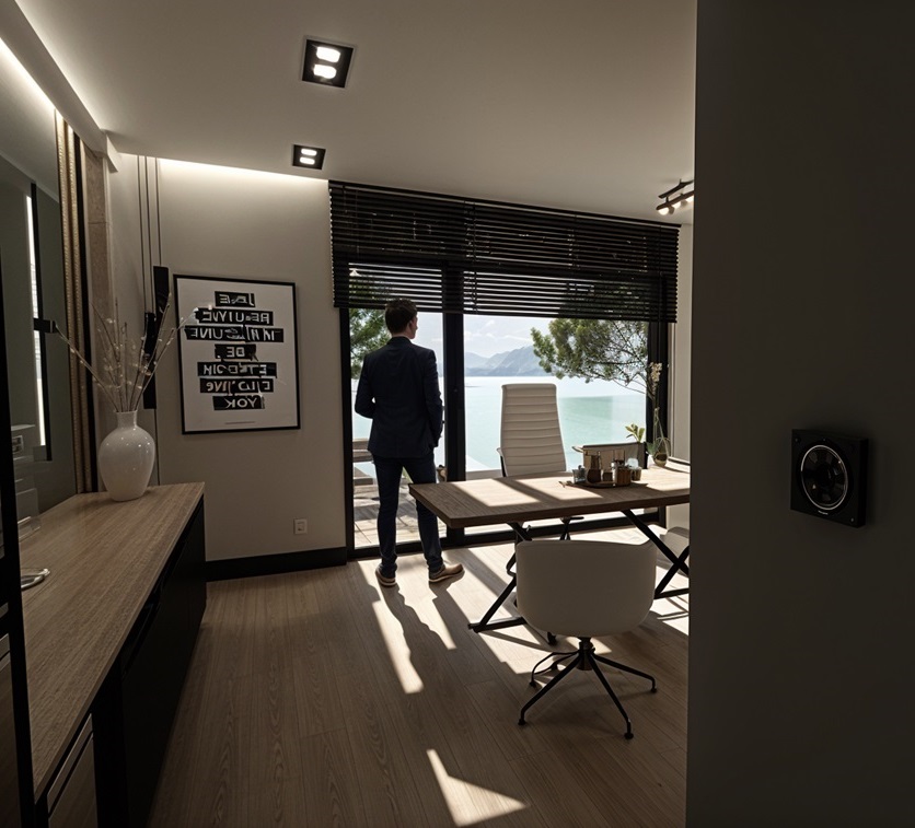 exterior shot put outside the window a blue warehouse and some trees architecture