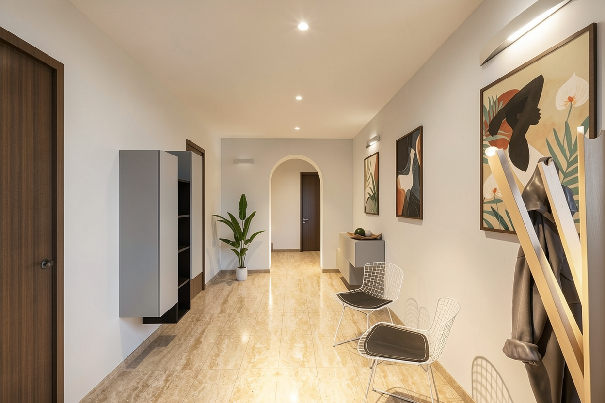 retain the structural element of the image add a big dinning set a side console with home decors and rug