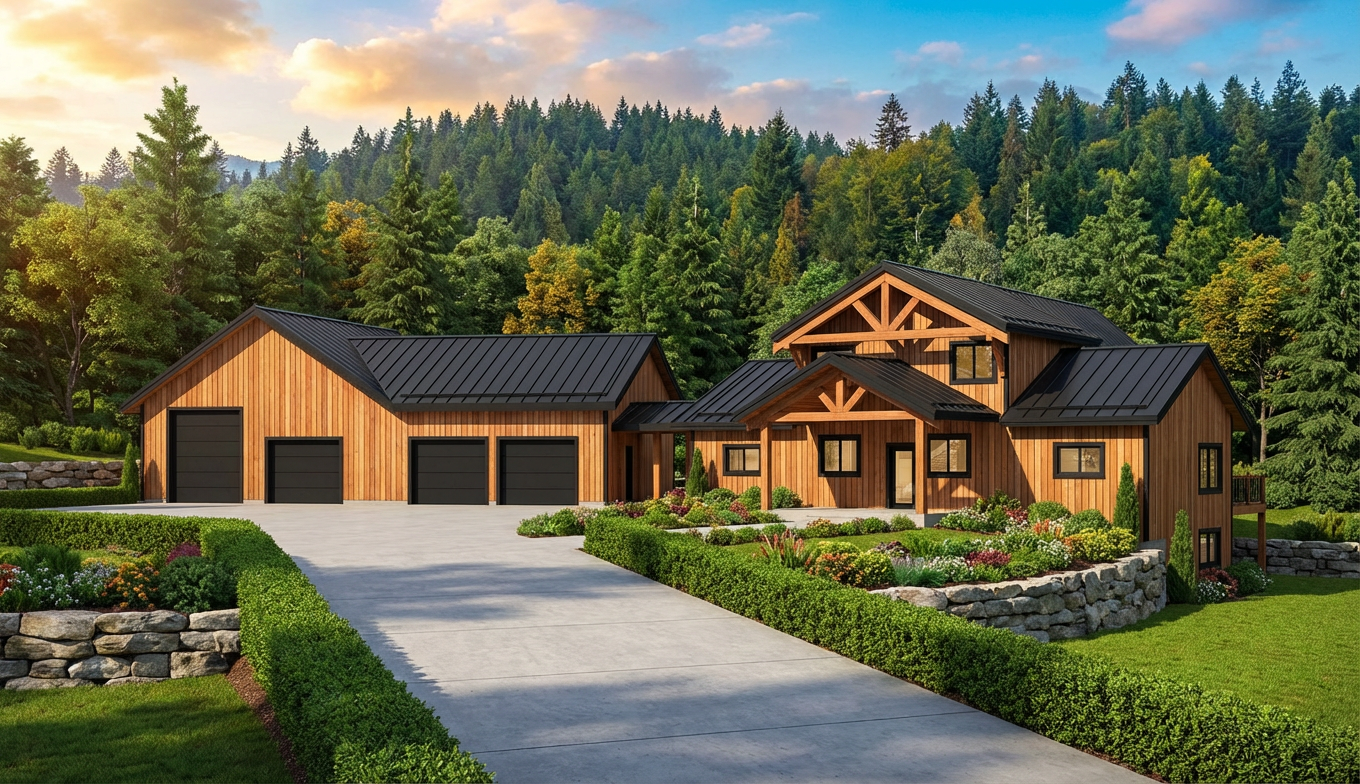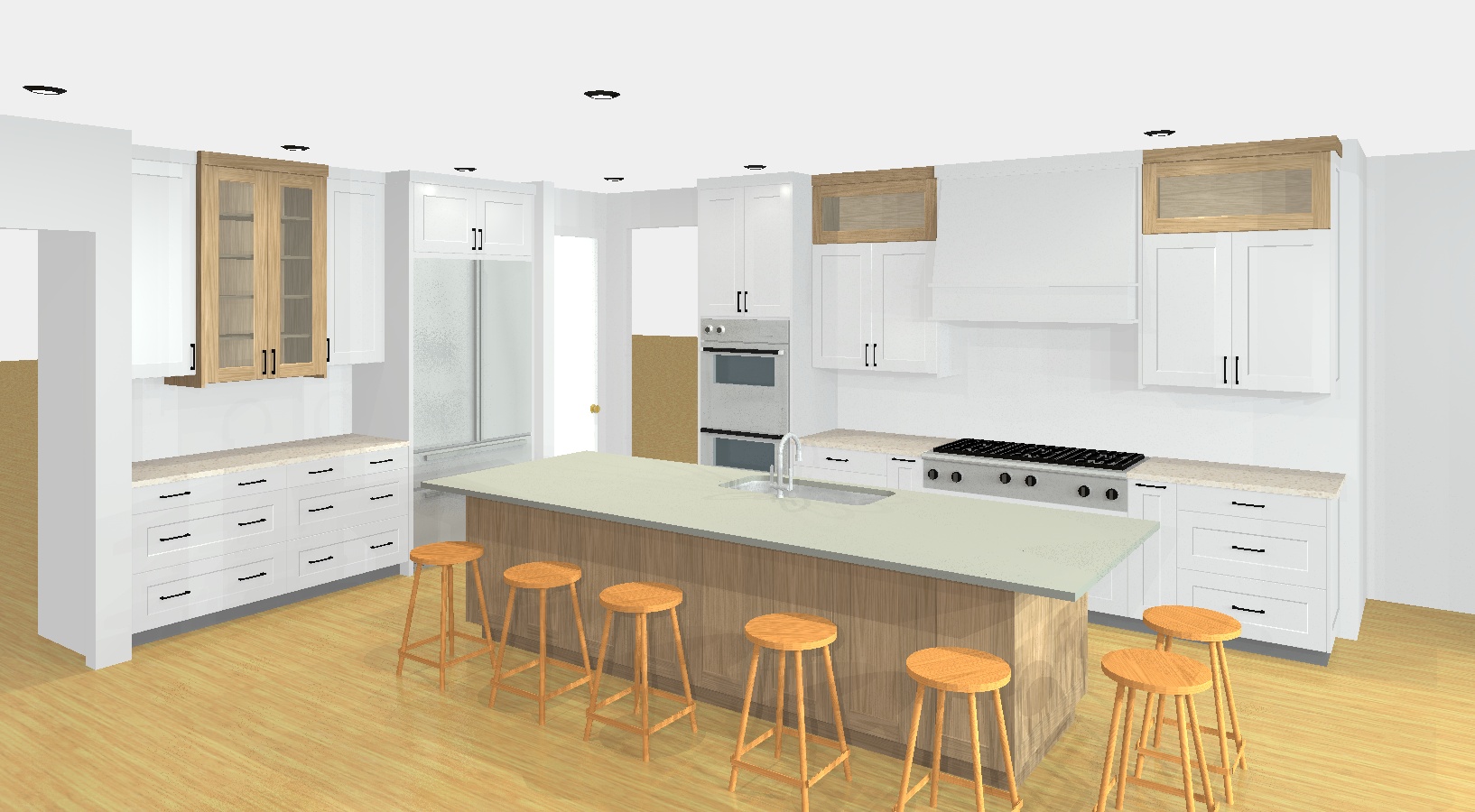 render a modern kitchen with a warm and inviting atmosphere emphasize a spacious white layout with sleek cabinetry use warm dark brown white oak wood accents on the cabinet tops and stools the kitchen island should be a light neutral color complemented by a brushed steel faucet add soft ambient lighting from recessed ceiling lights the floor should be a cool light oak finish enhancing the cozy feel incorporate minimalistic black handle details on cabinets for a contemporary touch ensure the overall mood is bright and welcoming with a balance of natural and modern elements