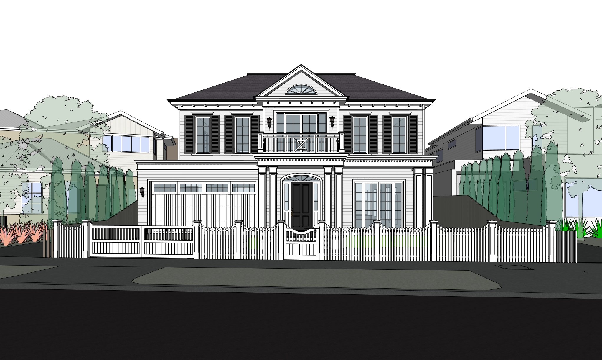 a symmetrical two story modern colonial suburban house with classic american architecture the exterior features white horizontal clapboard siding with crisp white trim and decorative crown moulding the roof is a dark charcoal slate roof with a central gable dormer containing an arched window black shutters frame tall grid windows across the facade the front entrance is centered with a black paneled door a small portico supported by white square columns and a subtle arched entry detail a double garage door on the left side is white with small glass panels along the top a low white picket fence surrounds the front yard with a matching gate aligned to the front pathway landscaping includes manicured green lawn neatly trimmed hedges tall slender evergreen trees and small ornamental trees in planters by the entrance the lighting is soft golden hour natural light with subtle reflections from a recently wet street surface creating realistic highlights and reflections color palette exterior siding warm white soft off white trim and columns bright white window shutters and front door matte black roof charcoal dark graphite slate roof fence white painted wood landscaping deep natural greens rendering style photorealistic architectural visualization ultra detailed materials painted wood siding metal roof glass reflections realistic global illumination and soft shadows 8k resolution high dynamic range clean suburban environment straight on symmetrical camera composition slight wet ground reflections camera eye level frontal elevation 35mm architectural lens centered composition full facade visible