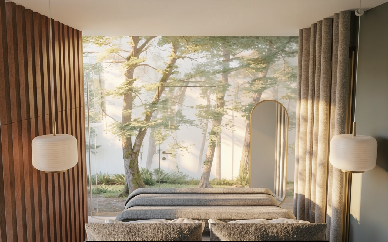 crea una imagen fotorealista a partir de esta de sketchup la luz natural entra desde la puerta de la izquierda da la calle y es un comercio cuidado entra como un rayo de niebla quitalo quiero la foto con claridad y sin ruido