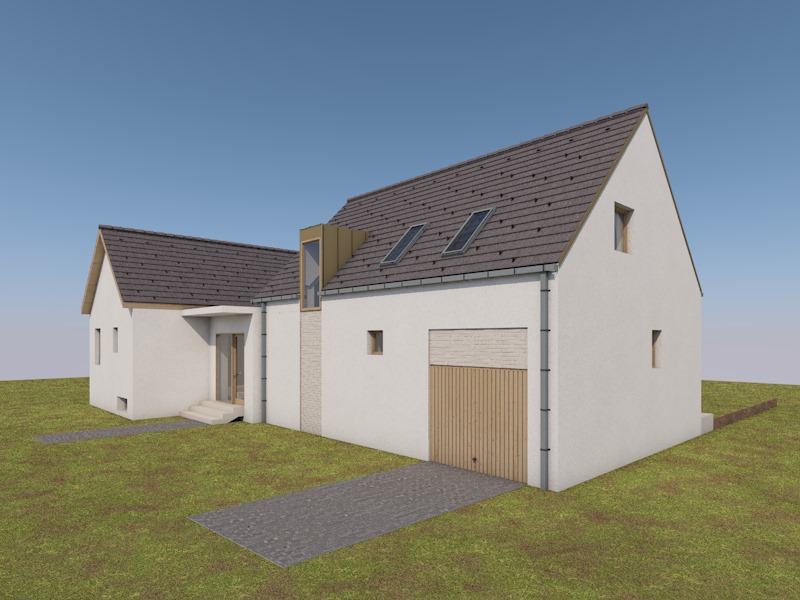 photorealistic enhancement of a residential house exterior preserve all existing materials surfaces colors and textures exactly as they are no redesign or alteration allowed only apply subtle quality improvements increase resolution sharpen textures enhance natural lighting and shadows slight color and contrast correction the facade roof cladding and windows must remain unchanged in form and material the environment garden sky vegetation can be refined to look more natural and detailed but not exaggerated or stylized do not add new elements or modify the architecture realistic daylight lighting balanced exposure