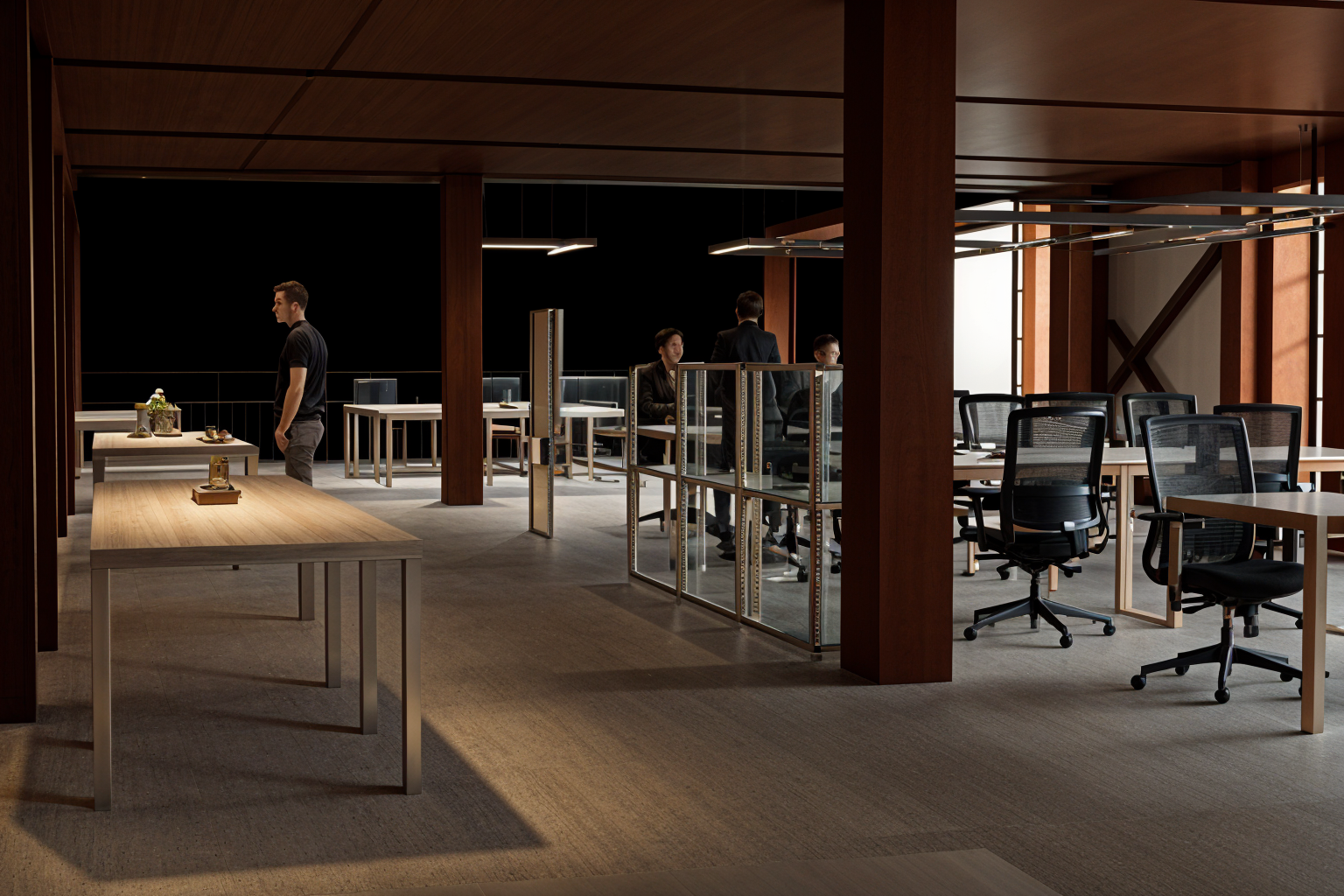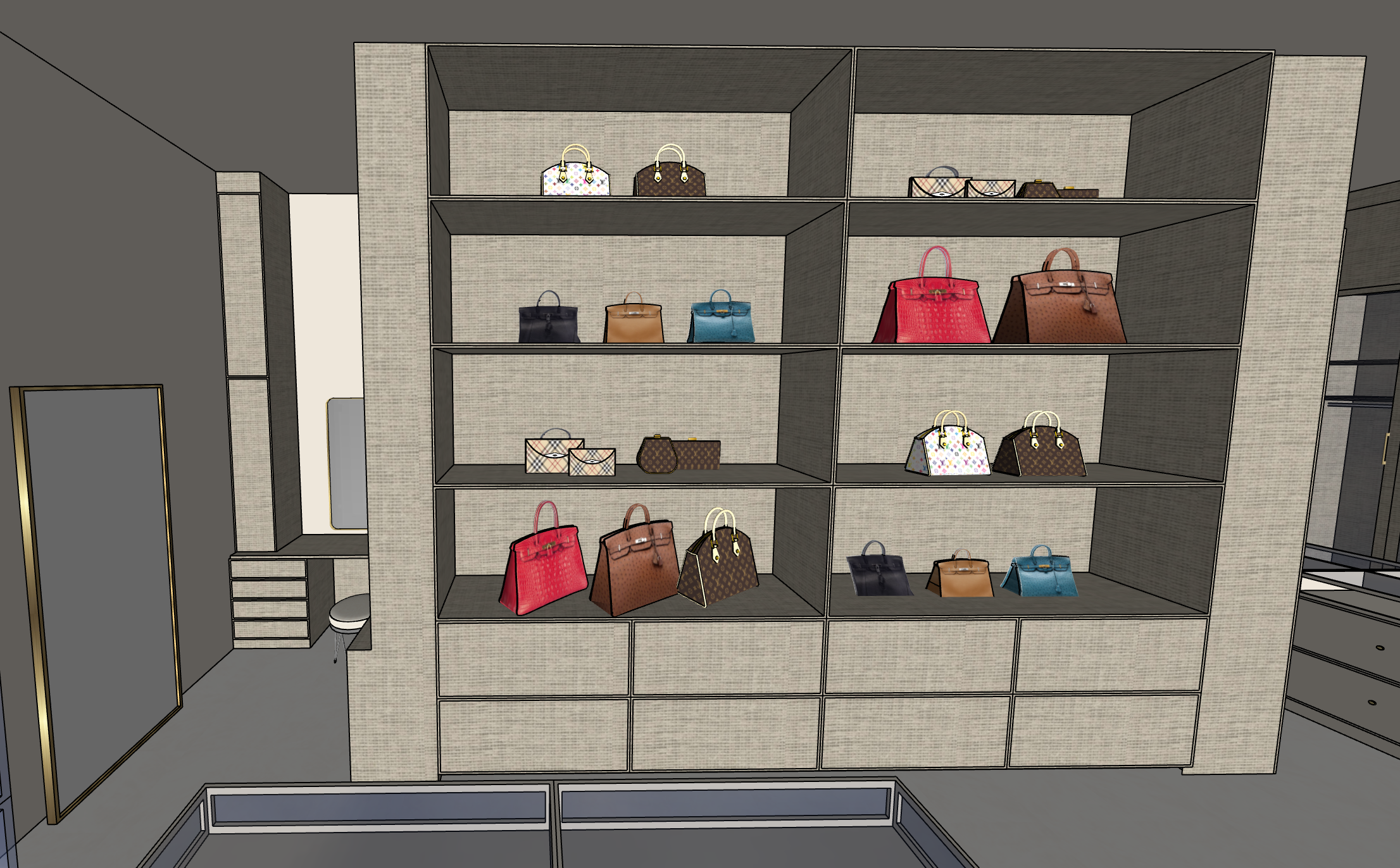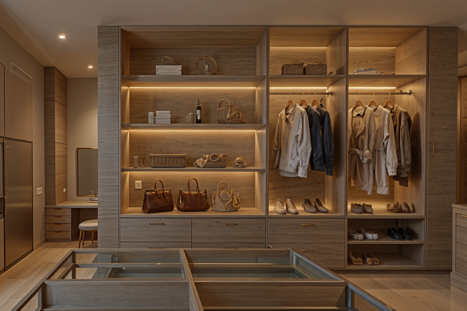 render a luxurious woman s walk in closet featuring sleek modern cabinetry with a light beige linen finish incorporate glass doors with subtle reflections creating a sense of openness use warm ambient lighting to evoke a cozy and inviting atmosphere the floor should be a smooth matte ivory tile add brass handles for a touch of sophistication the overall vibe should be elegant and serene with a focus on luxury and organization