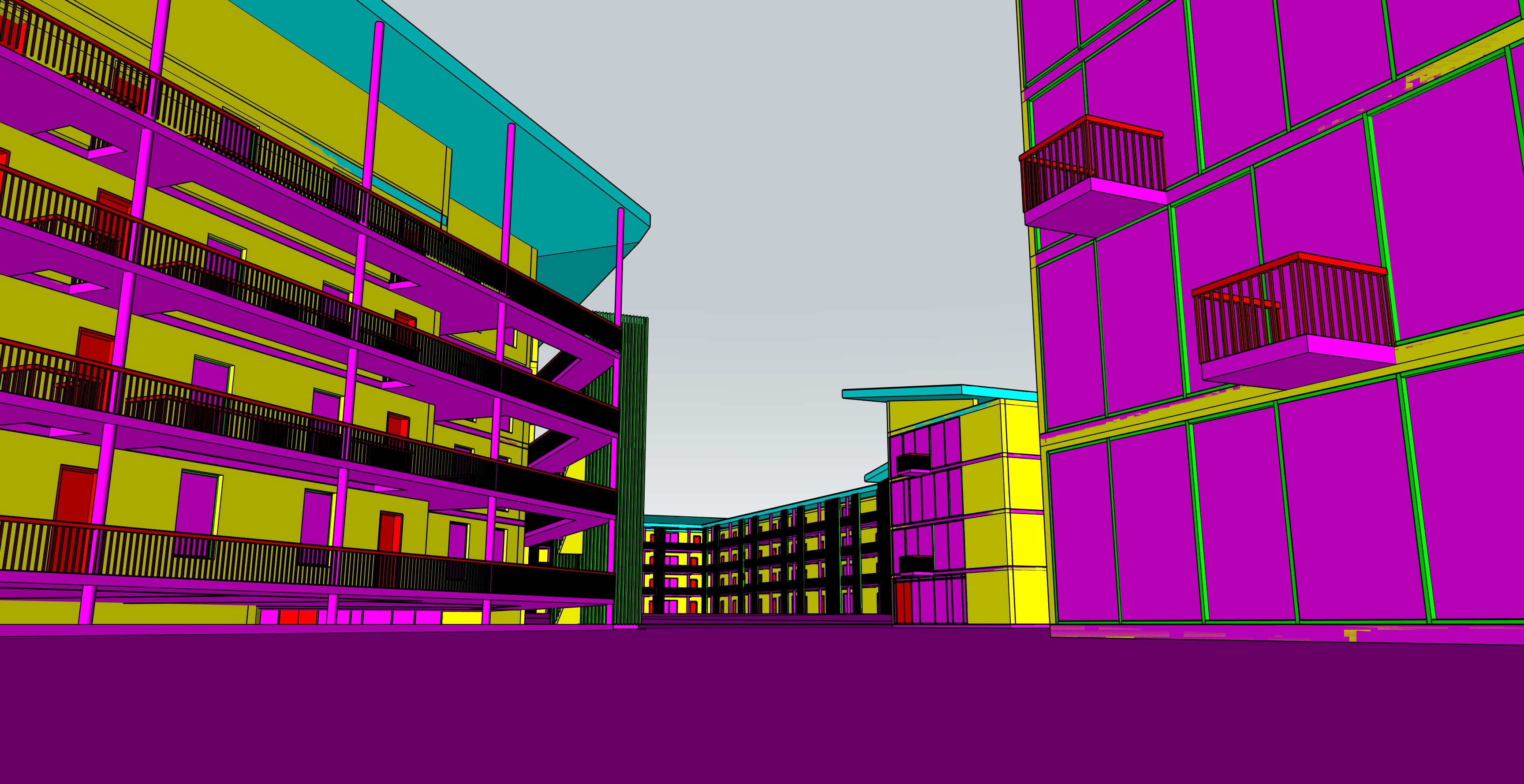 modernist exterior shot with a blue sky some clouds add some people cars and landscape in forground architecture