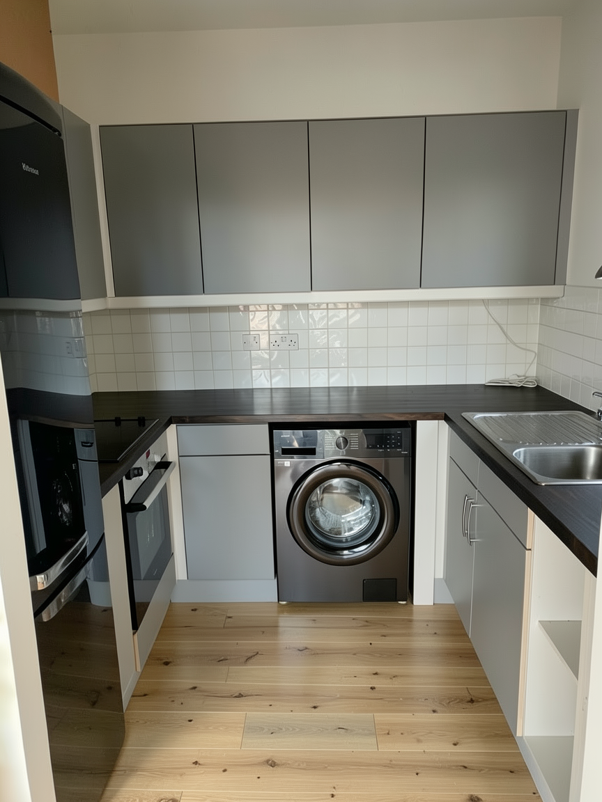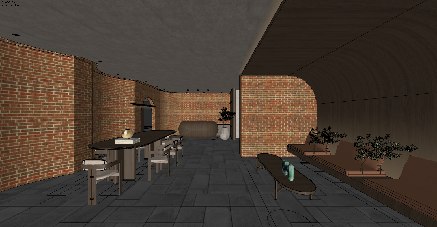 render a beautifully designed modern interior space with an elegant minimalist aesthetic the walls are crafted with warm rustic red bricks creating a cozy yet sophisticated atmosphere the floor is a smooth dark gray stone adding a sleek contemporary feel the ceiling features a soft matte gray finish subtly lit with recessed lighting to create a soothing ambience the long oval dining table is a rich dark wood accompanied by cushioned chairs in a light cream fabric add a vase with vibrant greenery on the table for a fresh touch the seating area has comfortable bench seating finished in a dark wood accented by soft earthy brown cushions decorate with artistic ceramic vases in muted sage green and soft teal hues potted plants add a natural element to the scene the overall atmosphere is warm inviting and chic combining natural textures with modern elements perfect for a stylish tranquil gathering space